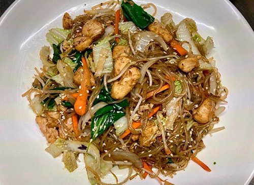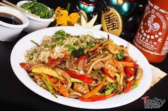 Verduras a la plancha, arroz frito y pollo con salsa agridulce.