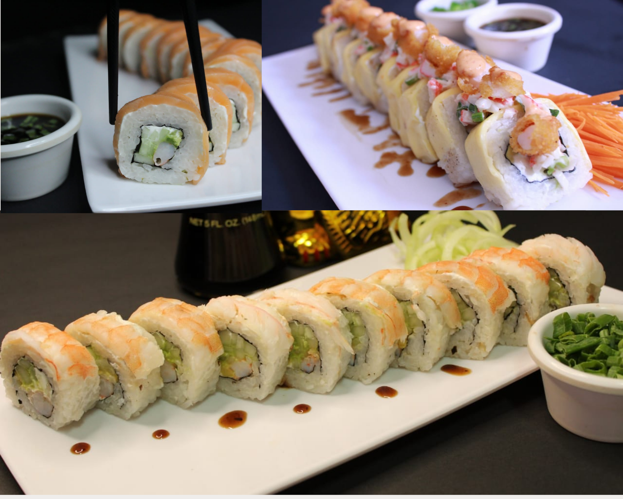 Kiwi, mango, fresa por afuera y por dentro de lo que el cliente quiera (res, pollo, surimi, camarón), con pepino Philadelphia y aguacate.