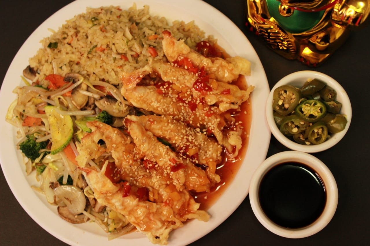 Camarones capeados bañados con salsa agridulce verduras a la plancha y arroz frito.