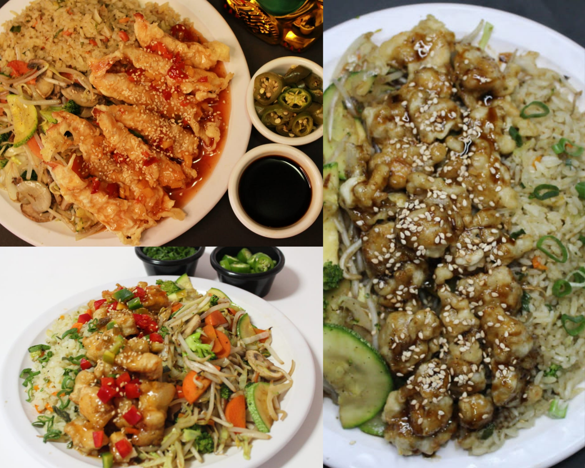Verduras a la juliana pasta udón, arroz frito, pollo, res y camarón a la plancha.