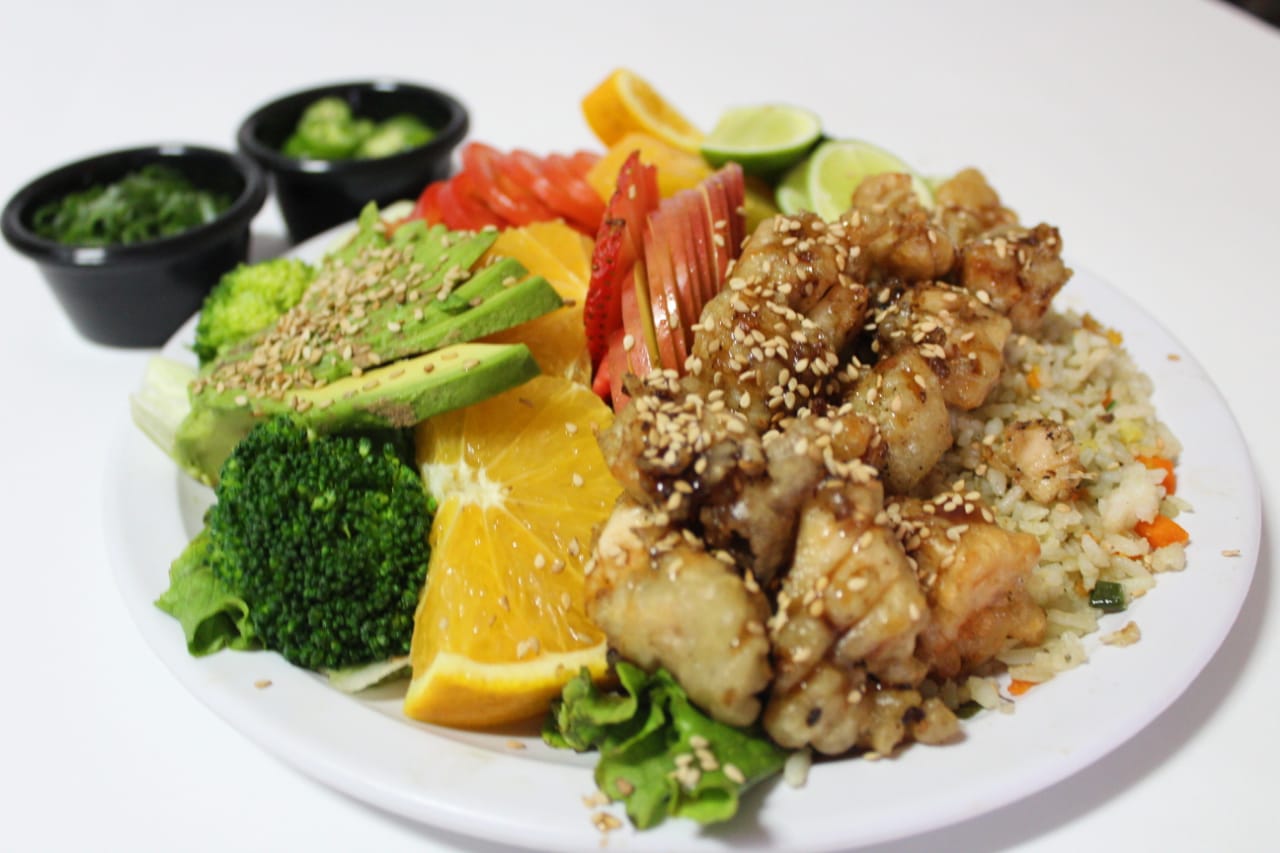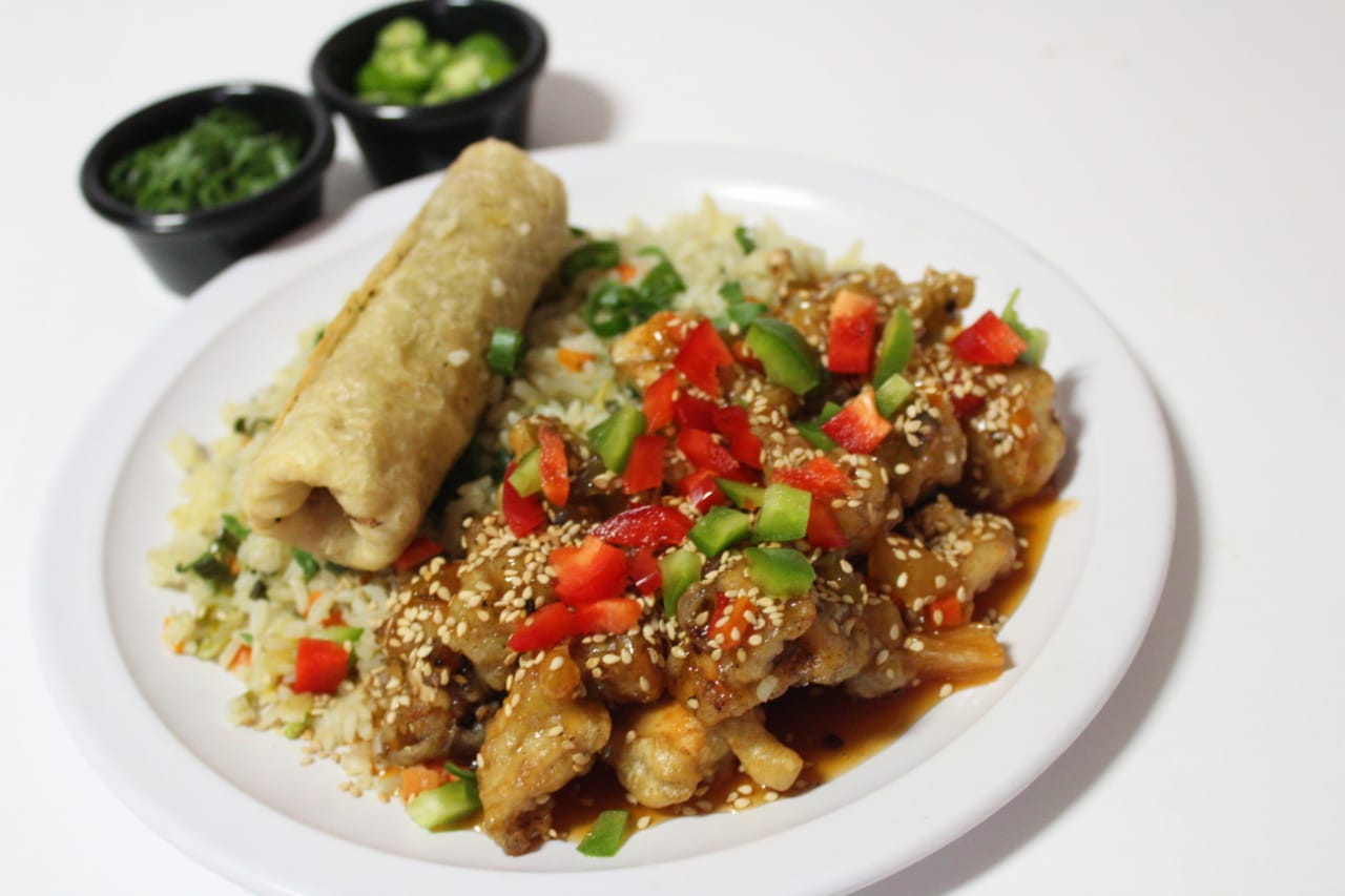 Verdura a la plancha, arroz frito y pollo capeado con gravy a la naranja.