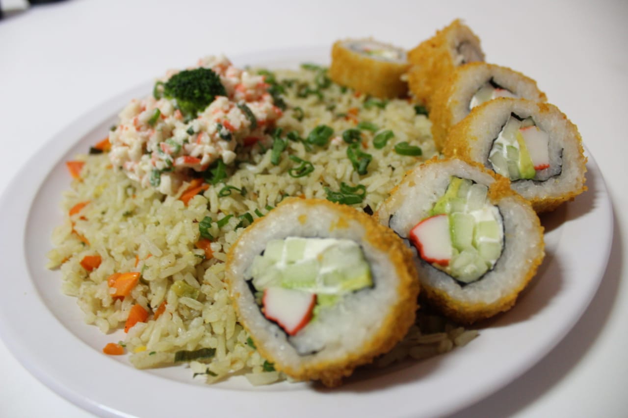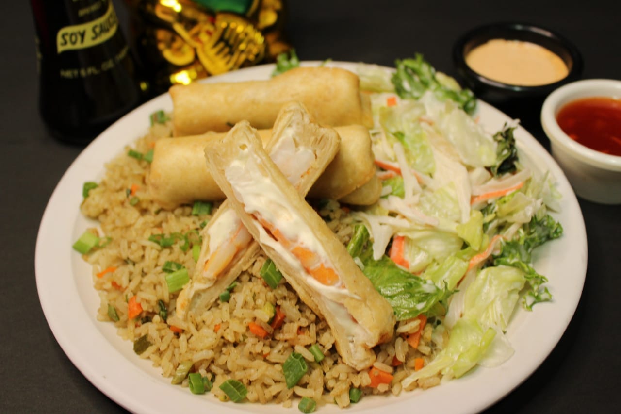 Rollitos rellenos de Philadelphia y camarón envueltos en tortilla de harina, acompañados con arroz frito y ensalada kani.