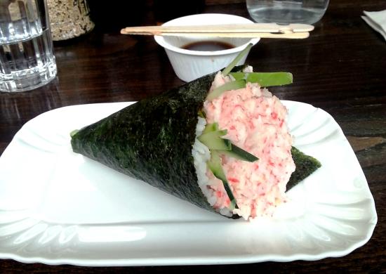 Bola empanizada de Philadelphia, pepino, aguacate, camarón empanizado, ensalada, Tampico y aderezo de chipotle.