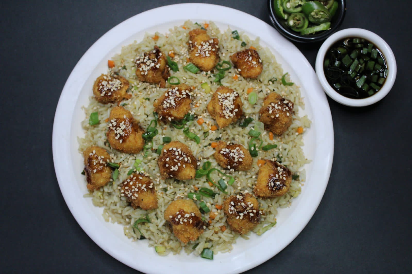Bolitas de pollo empanizadas, bañadas con salsa de anguila acompañado de arroz frito.