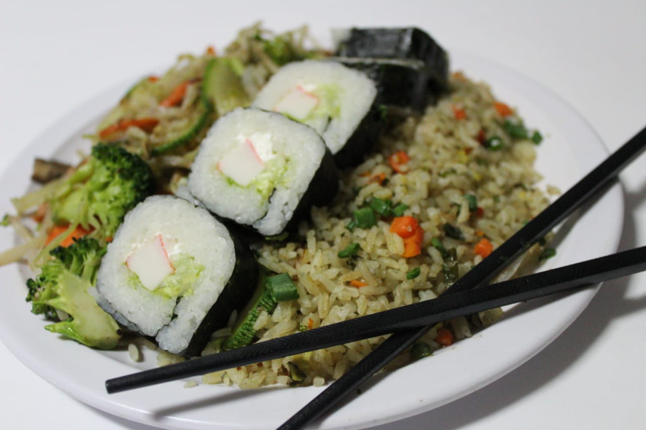 Verduras a la plancha y arroz frito acompañado con pescado surimi y camarón.