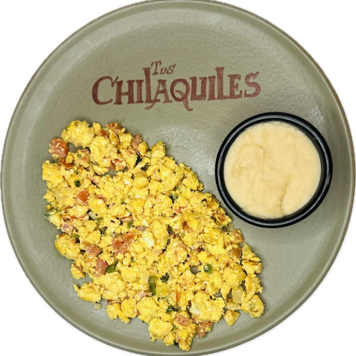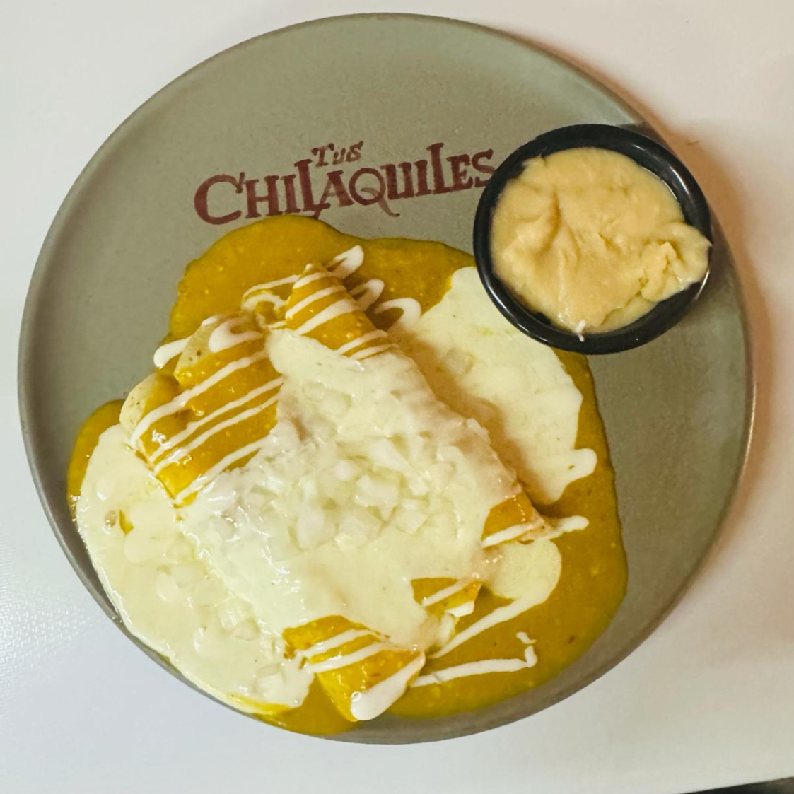 Chilaquiles con totopo dorado, con salsa cremosa habanera, cebolla, queso, frijol y birote aparte.