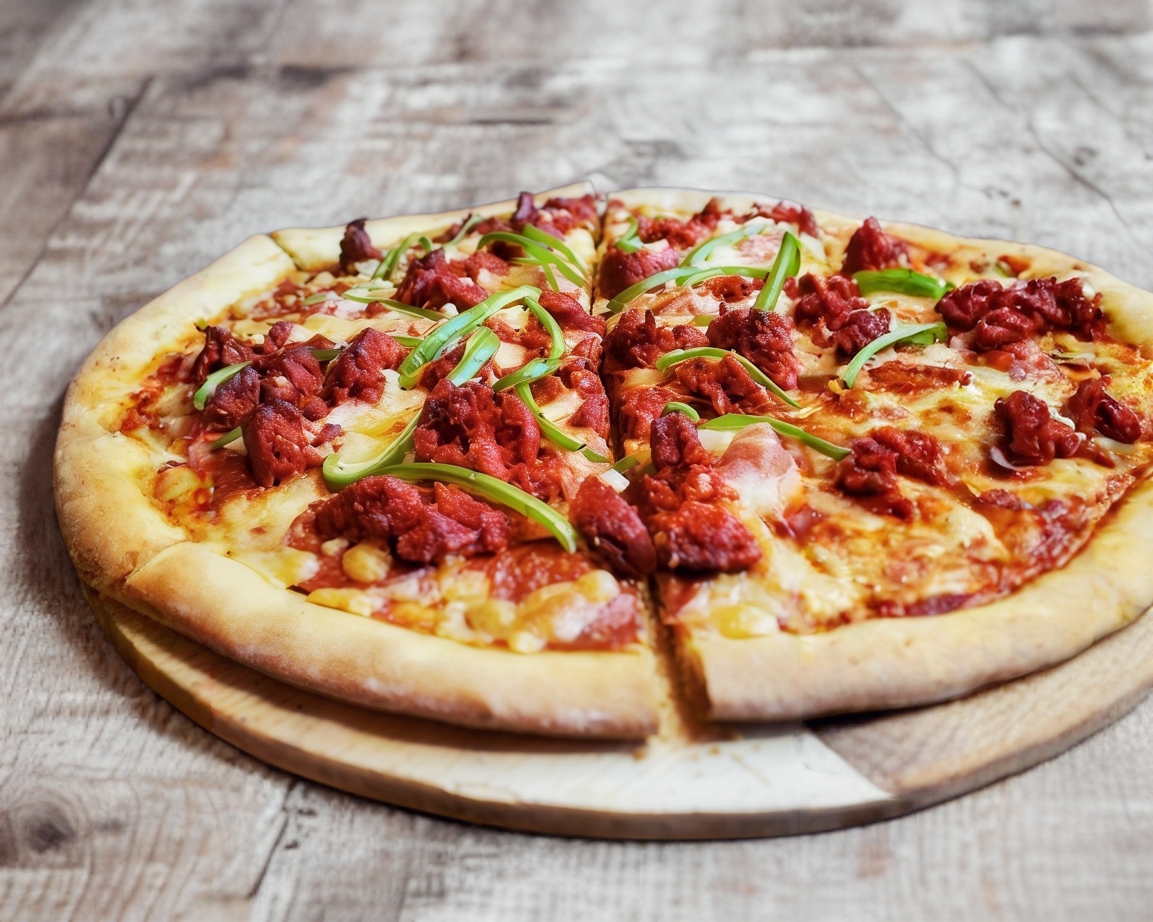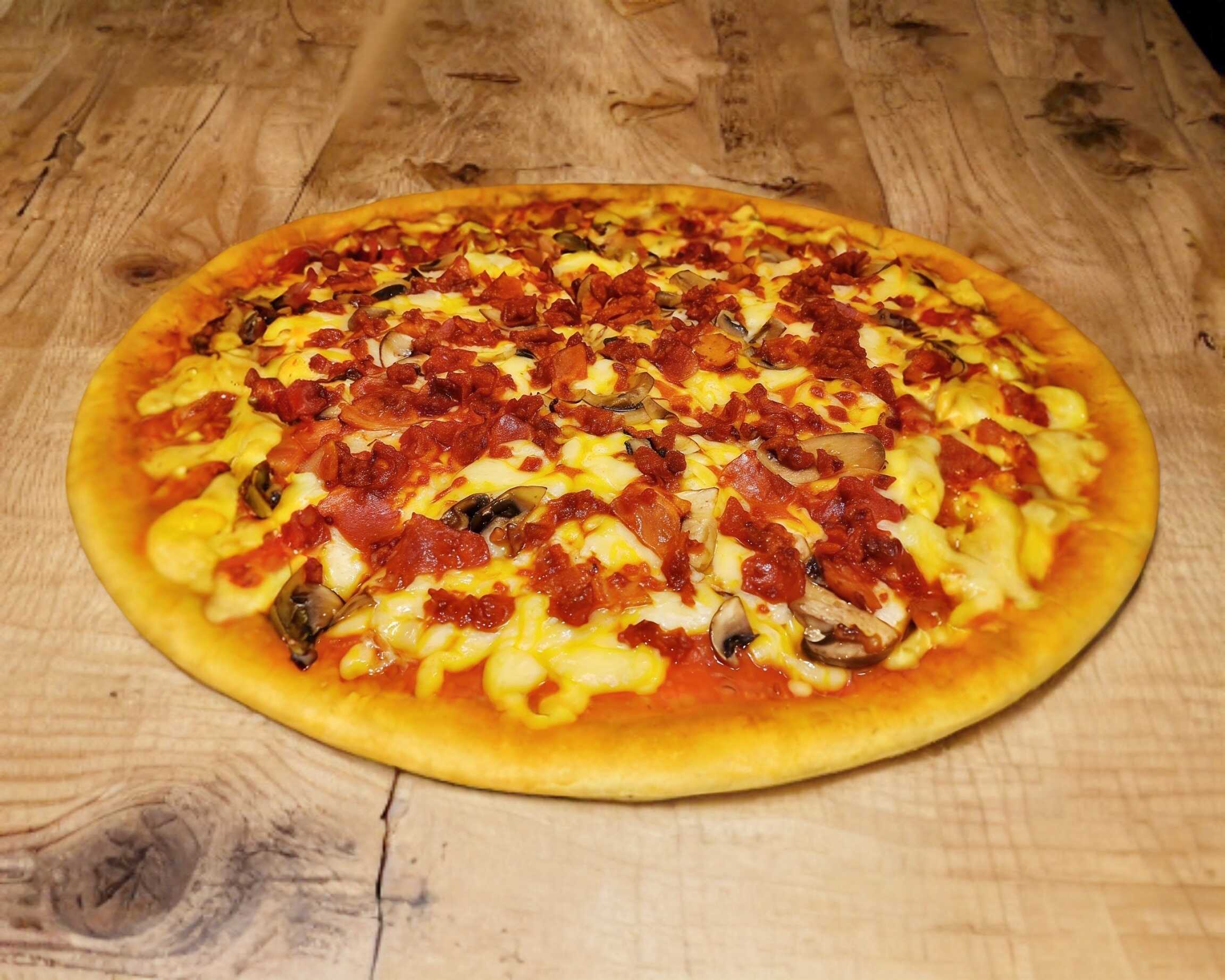 Tamaño: 6 rebanadas (30 cm ) Pizza estilo romana cubierta de pomodoro, queso, jamon y chorizo. (Porción personal)