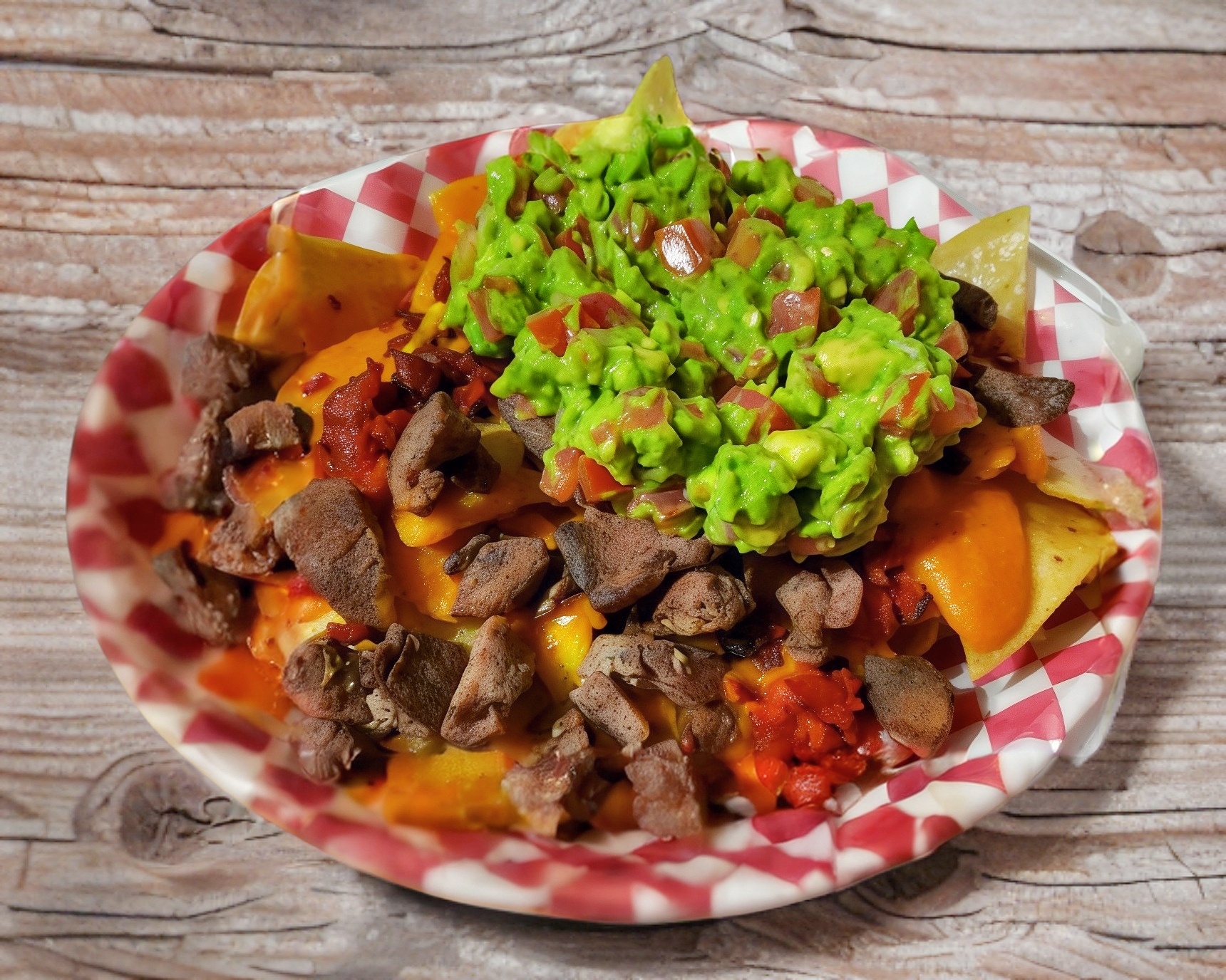 Totopos, arrachera, chorizo, bañados con queso y salsa de frijol, con guacamole y chiles jalapeños.