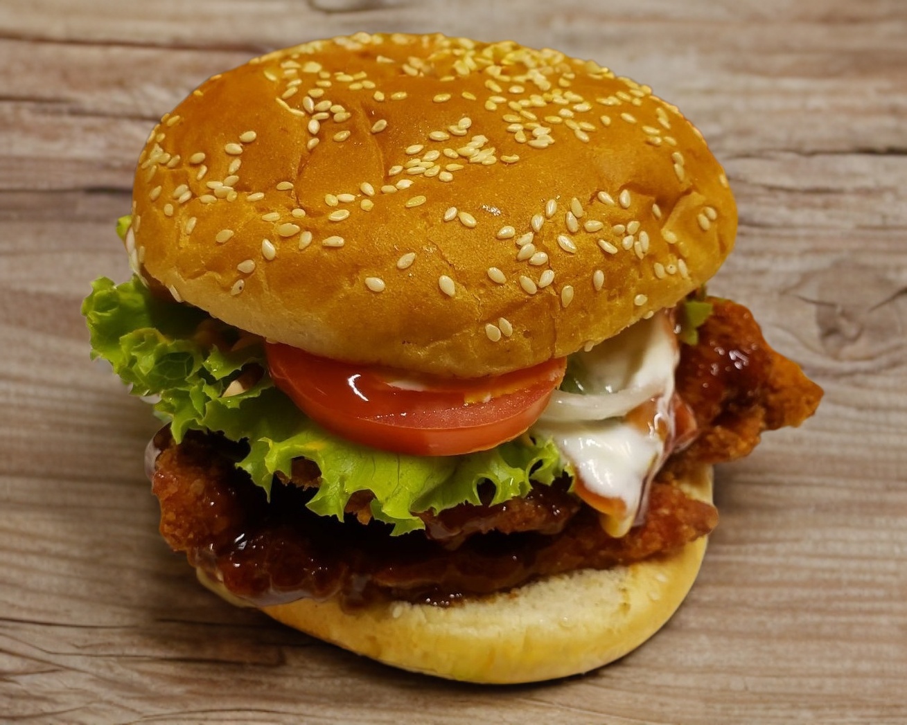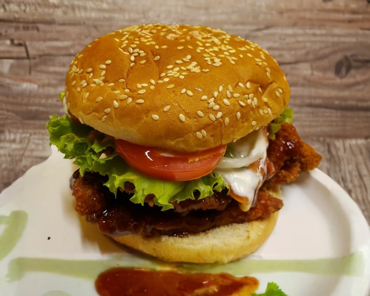 Milanesa de pollo empanizada, cubierta de bbq, queso, verdura .