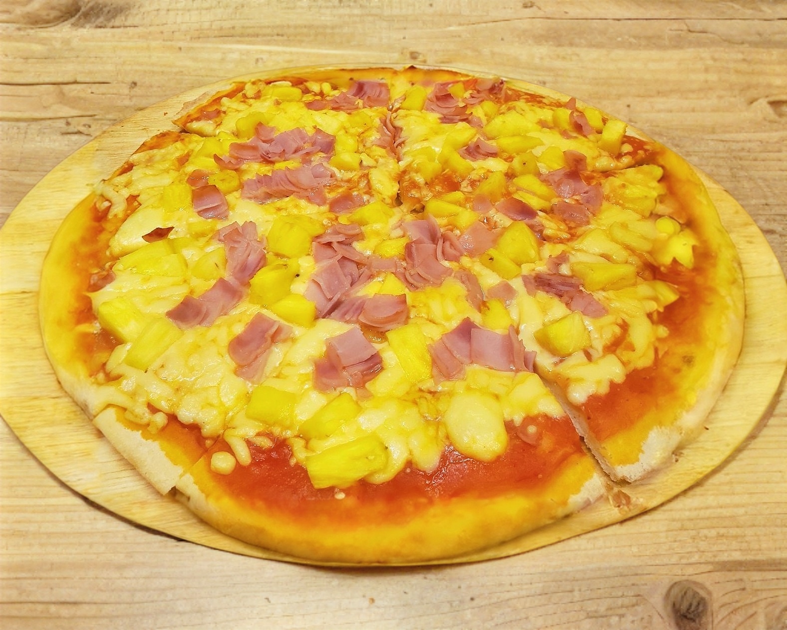Masa delgada con cubierta de pomodoro,queso manchego, piña y jamón.