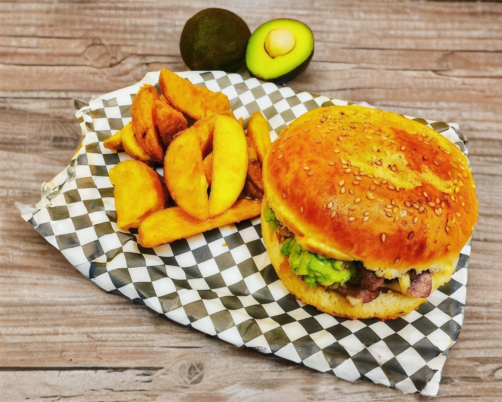Arrachera, guacamole y queso, envuelto en tortilla de harina con orden de papas.