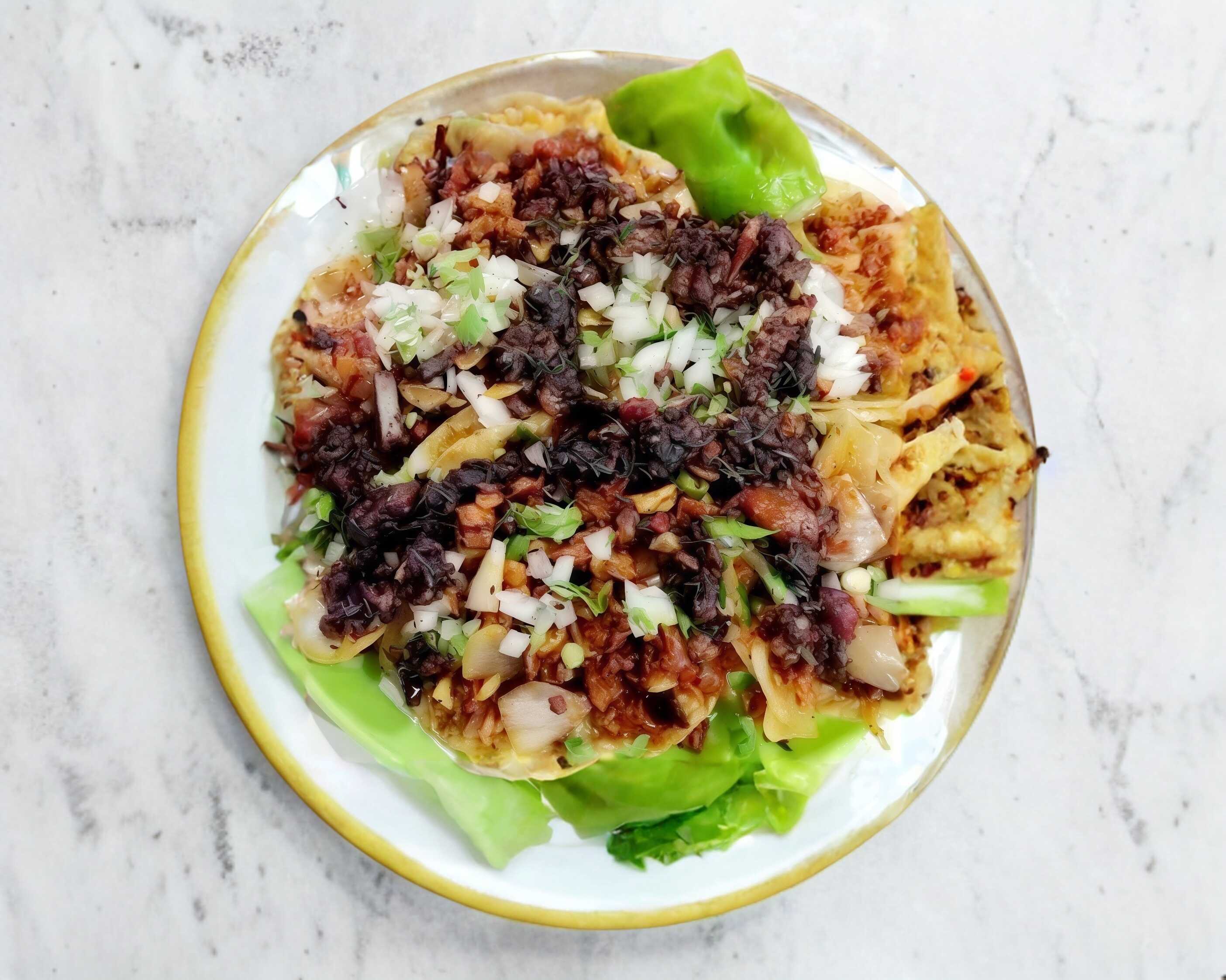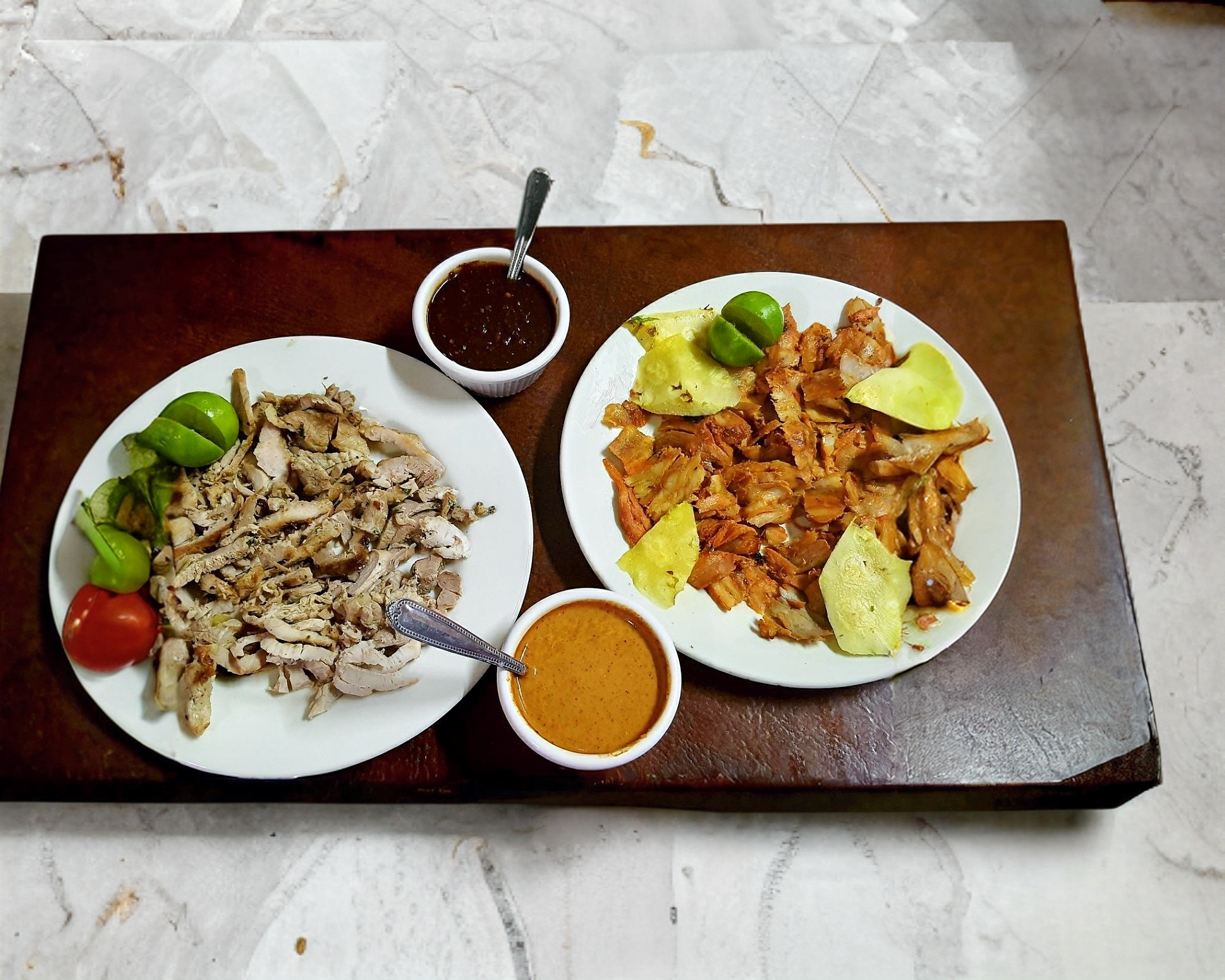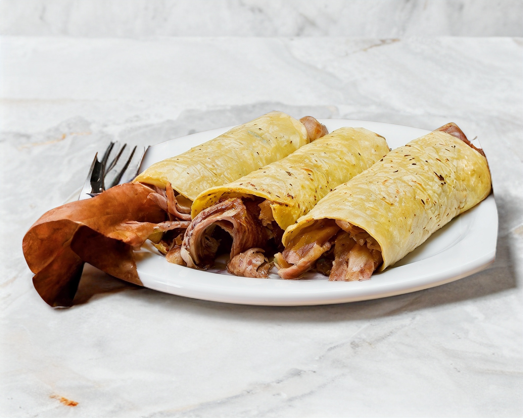 Pimiento morron, cebolla, tocino y carne árabe. Acompañada con dos piezas de pan árabe y cinco tortillas de maíz más salsa de chipotle y cacahuate