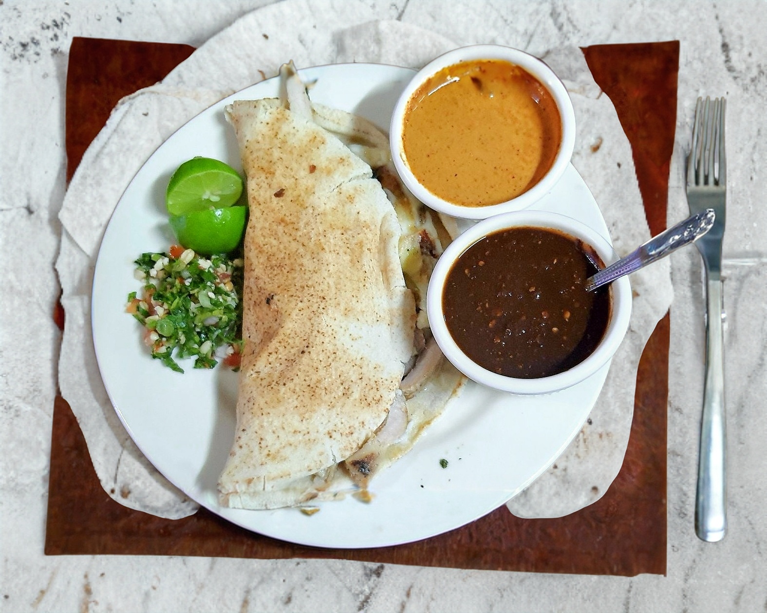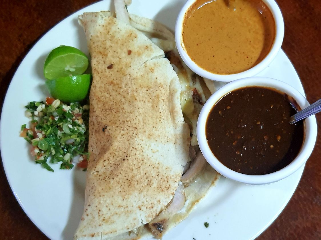 Carne árabe (50 g) con queso, servida sobre pan árabe doblado, acompañada de salsa de chipotle y cacahuate.