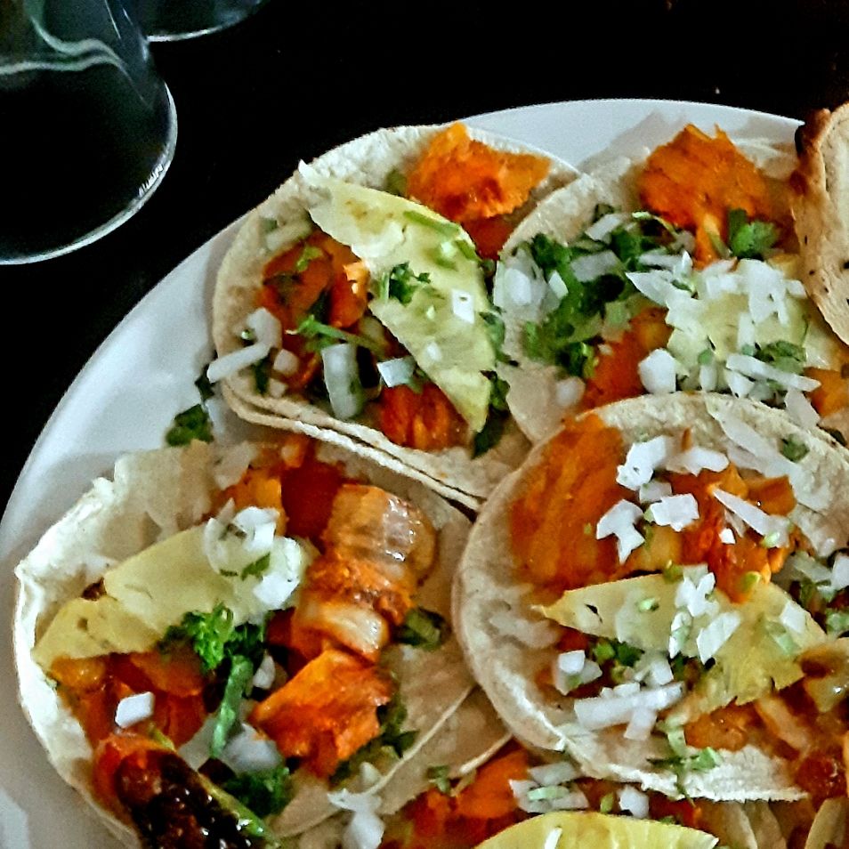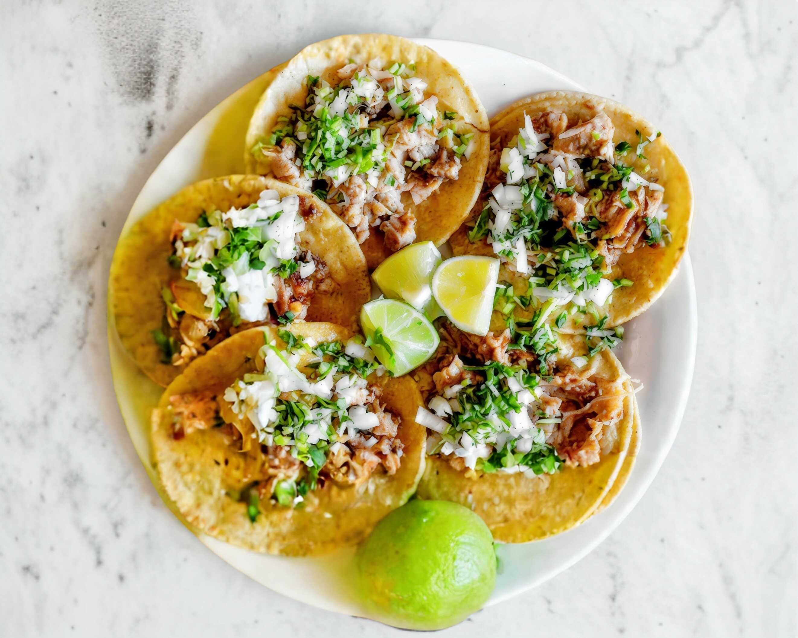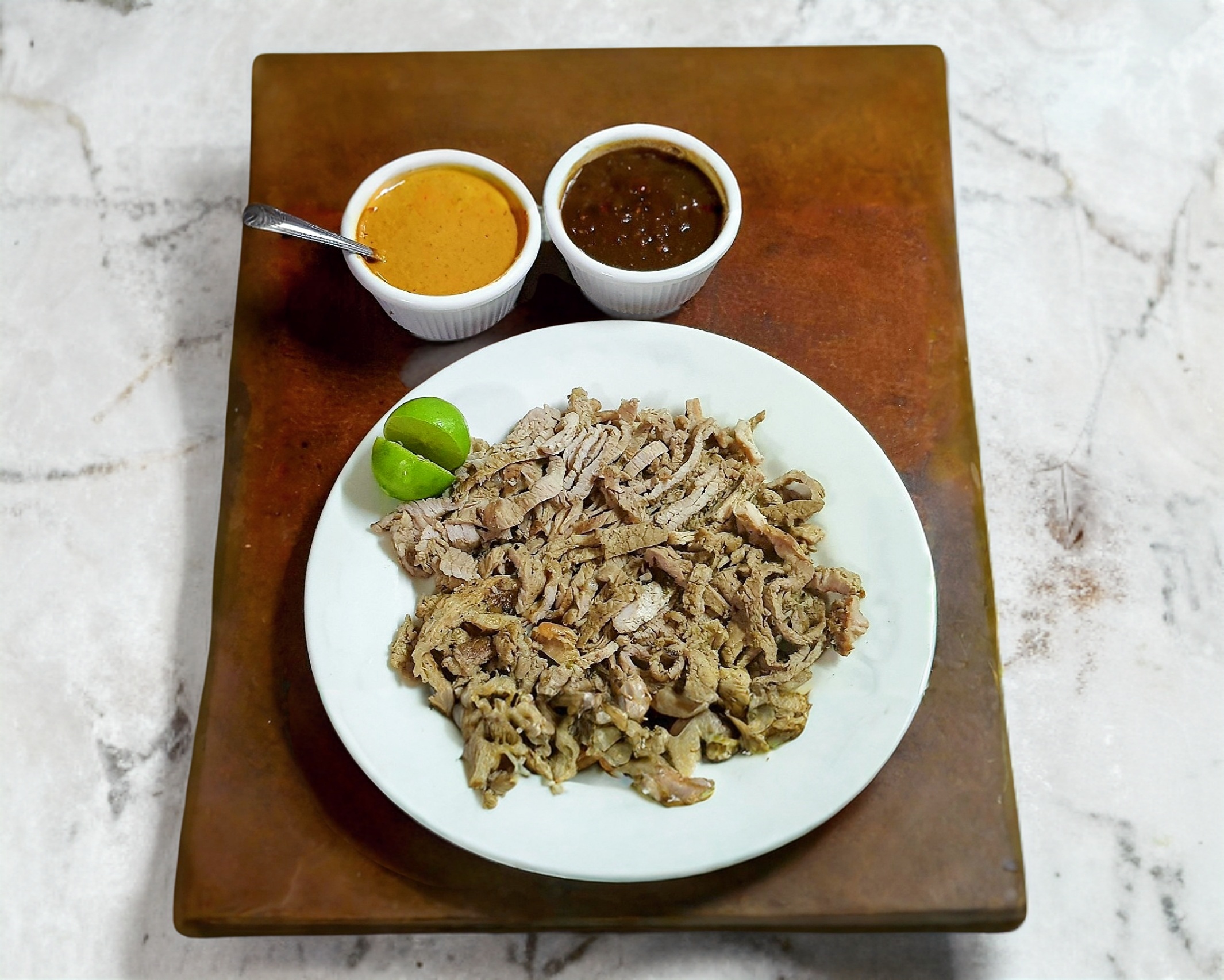 carne de puerco marinada tipo Gaona servido en taquitos acompañado con salsas de la casa