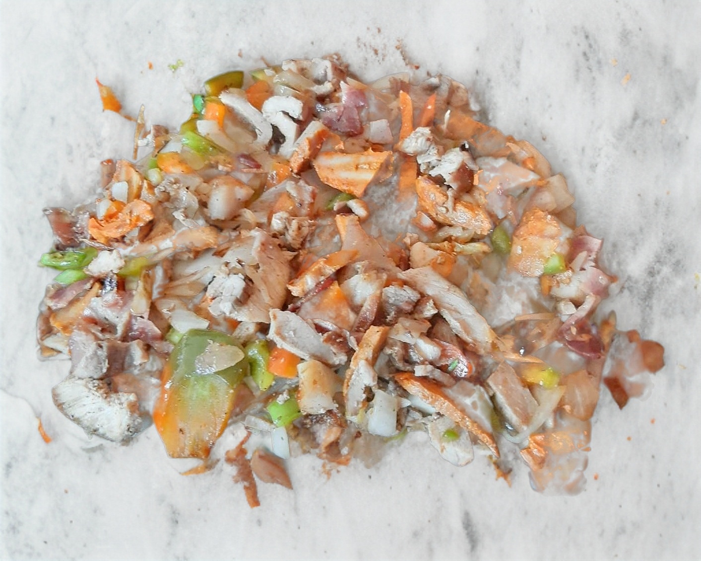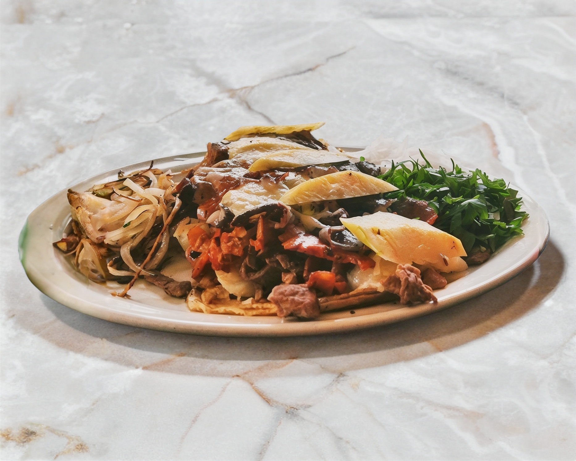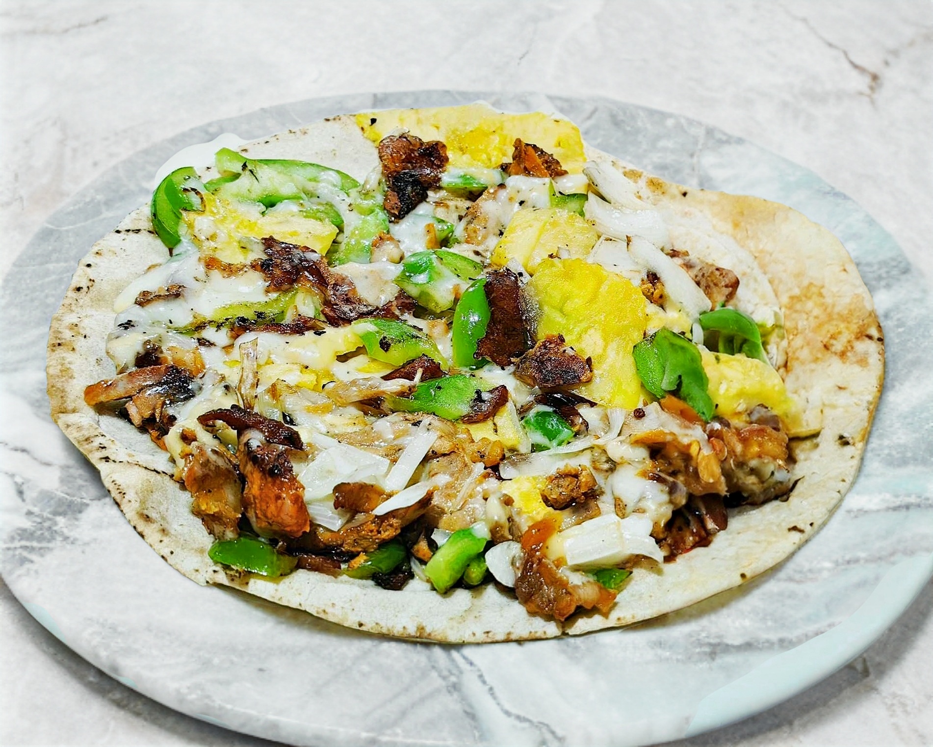 Pimiento morron, cebolla, tocino carne árabe y queso gratinado acompañado con dos pan árabes y cinco tortillas de maíz más salsa de chipotle y cacahuate.