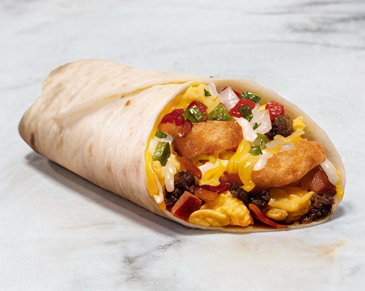 carne a elegir, frijoles, carne, chile morrón y queso en tortilla de harina jumbo