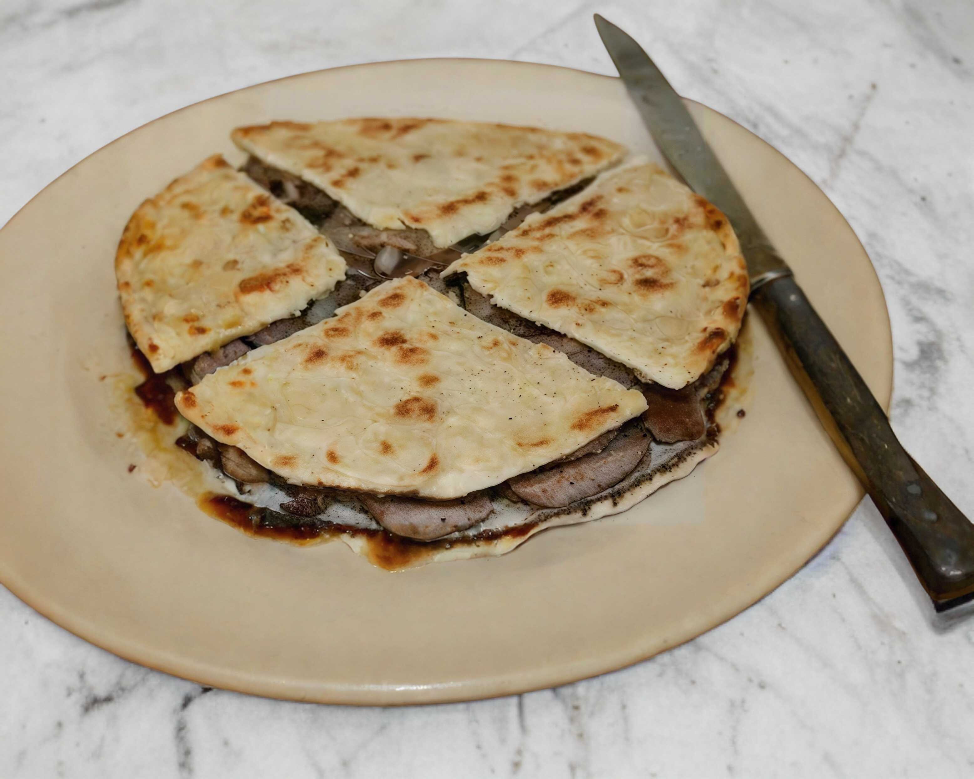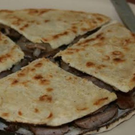 carne árabe y queso en una tortilla de maíz doblada en forma de quesadilla