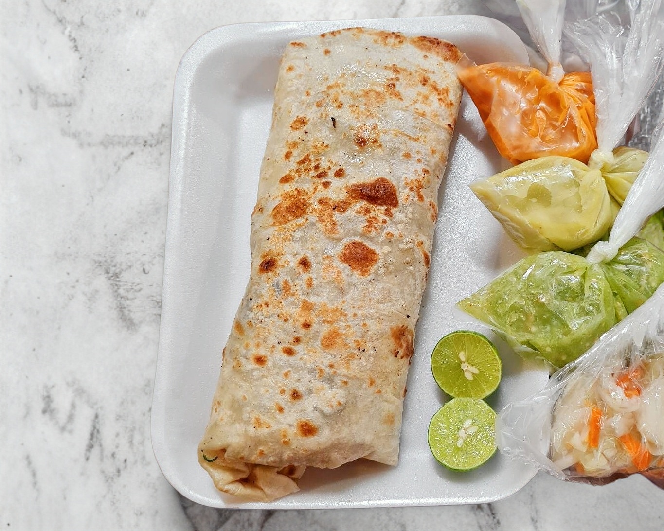 Carne árabe 70g.enrollado en un pan árabe o pan pita, con salsa de chipotle y cacahuate