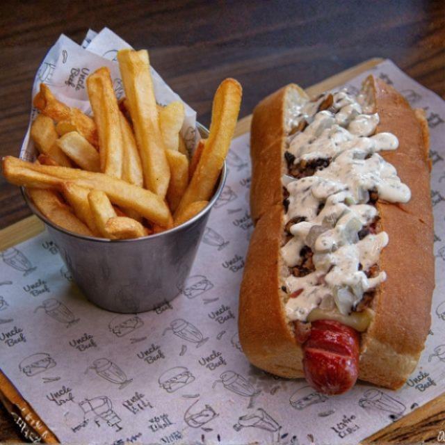 Salchicha 100% de res de 120g en pan brioche, queso gouda, champiñones, cebolla caramelizada, aceituna negra y aderezo de ajo con papas a la francesa