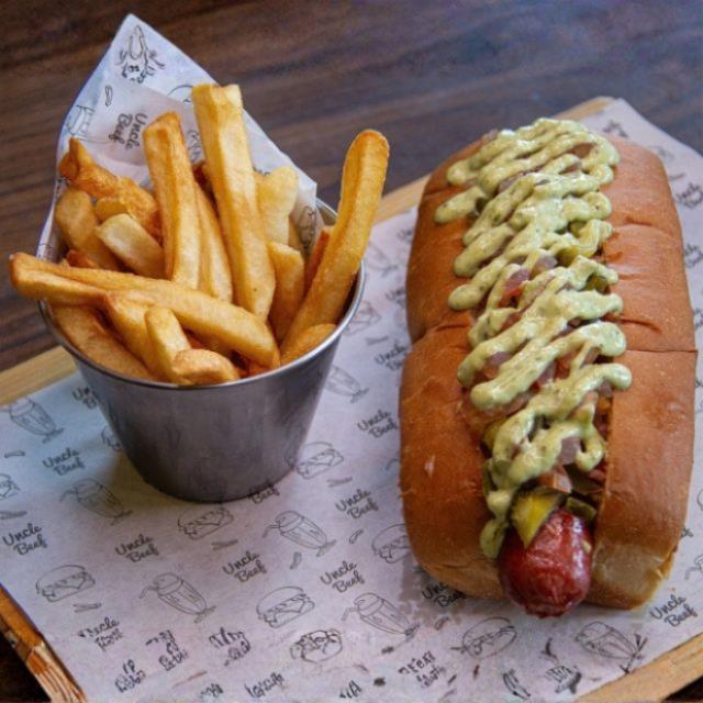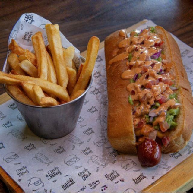 Salchicha 100% de res de 120g en pan brioche, queso cheddar, tocino, guacamole, jitomate, cebolla morada y aderezo chipotle. Con papas a la francesa.