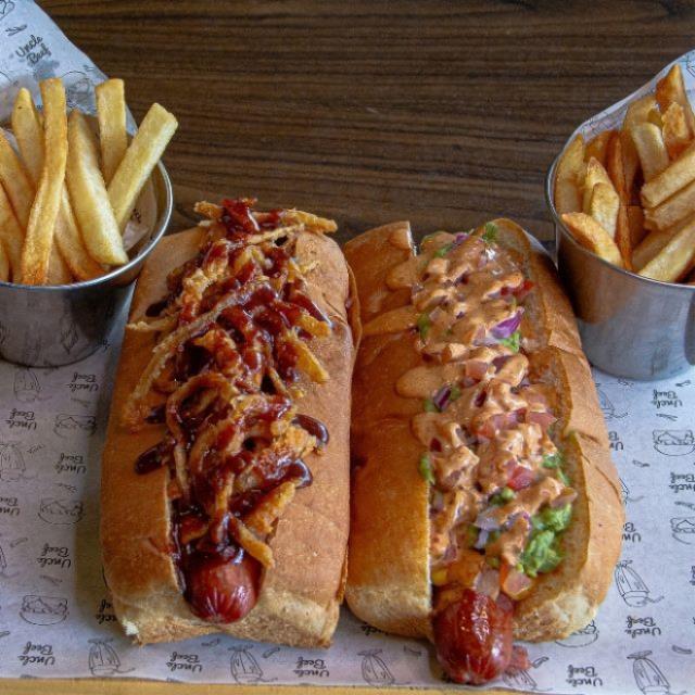 2 Dogos de tu elección + 2 papas a la francesa de 150gr cada una.