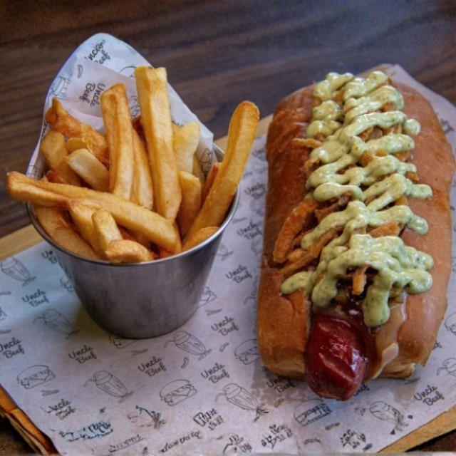 Salchicha 100% de res de 120gr en un delicioso pan brioche, queso cheddar, tocino, cebollita frita y aderezo bbq. Con papas a la francesa.