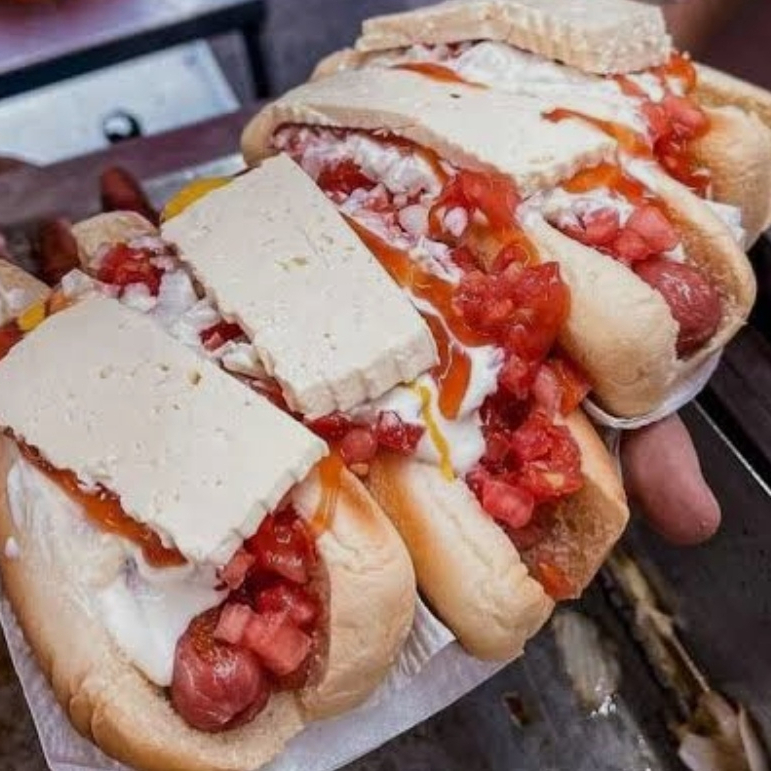 Salchicha de pavo con queso blanco, cebolla caramelizada y chorizo