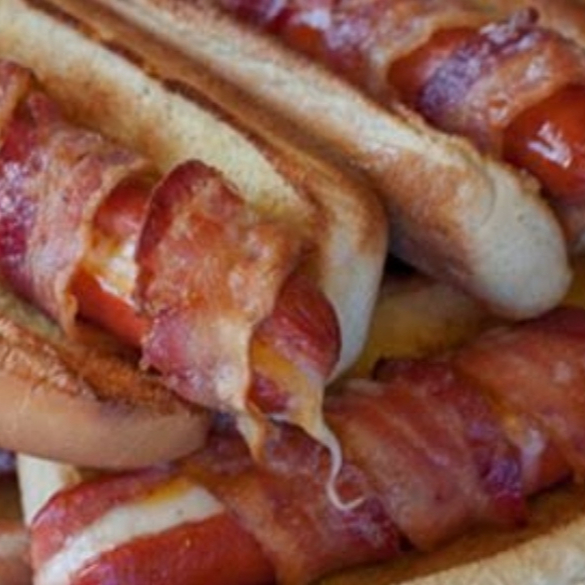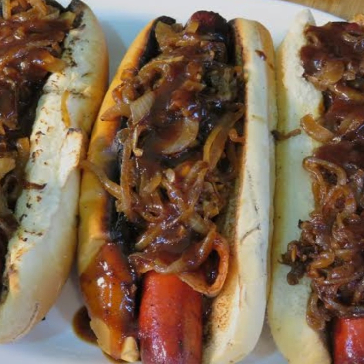 Salchicha de pavo, panela, cebolla caramelizada, BBQ y tocino