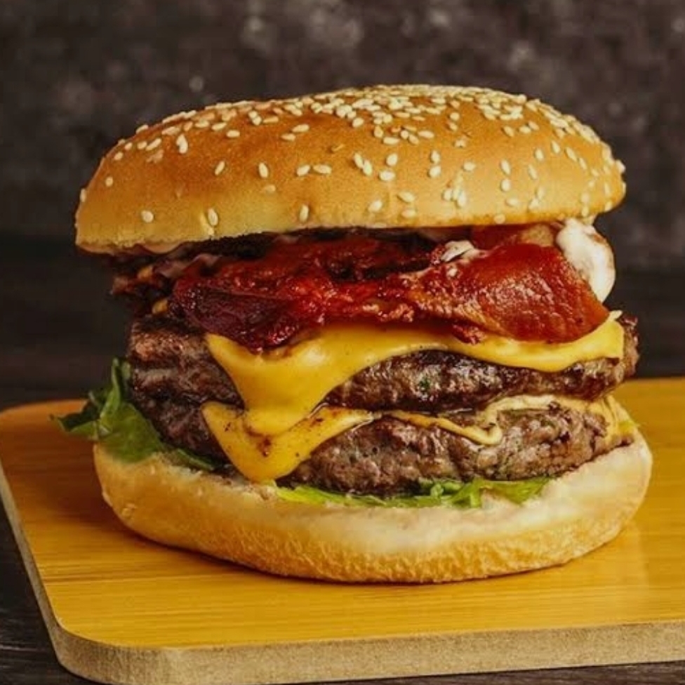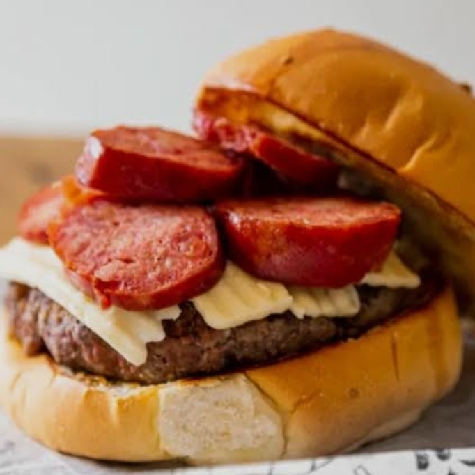 Monstruosa doble carne. Una carne con queso amarillo, cebolla caramelizada, BBQ y tocino, otra carne con queso blanco y salchicha