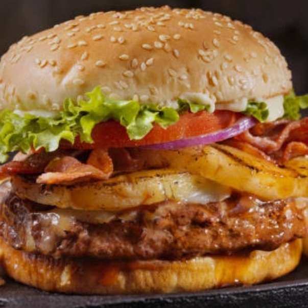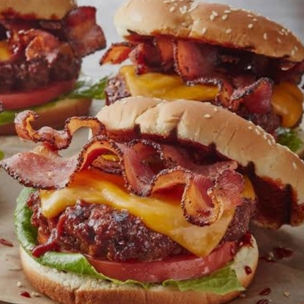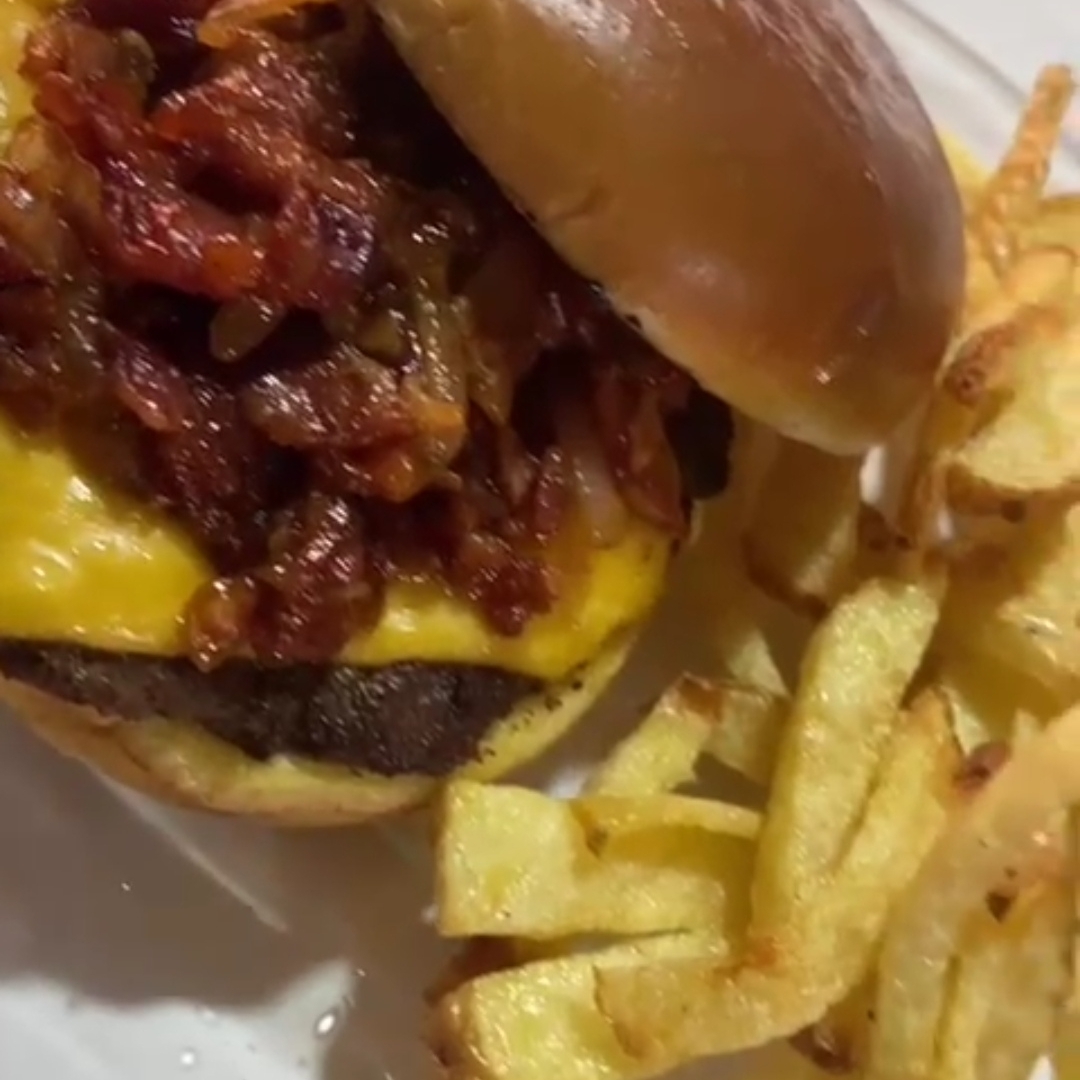 Con queso amarillo y nuestra mermelada de tocino de la casa, con cebolla caramelizada, BBQ y tocino