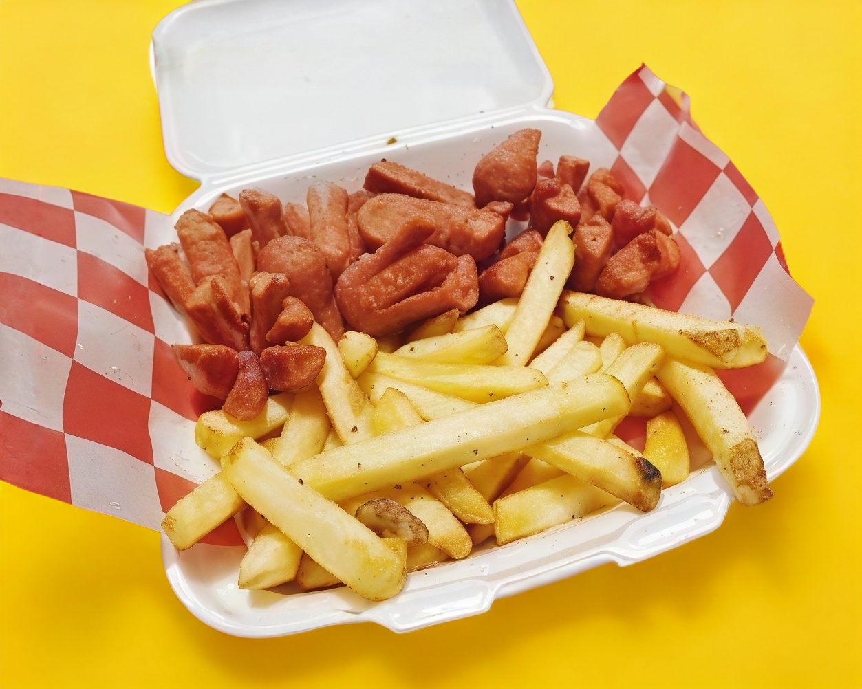 Salchicha acompañada de papas.