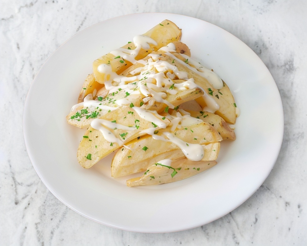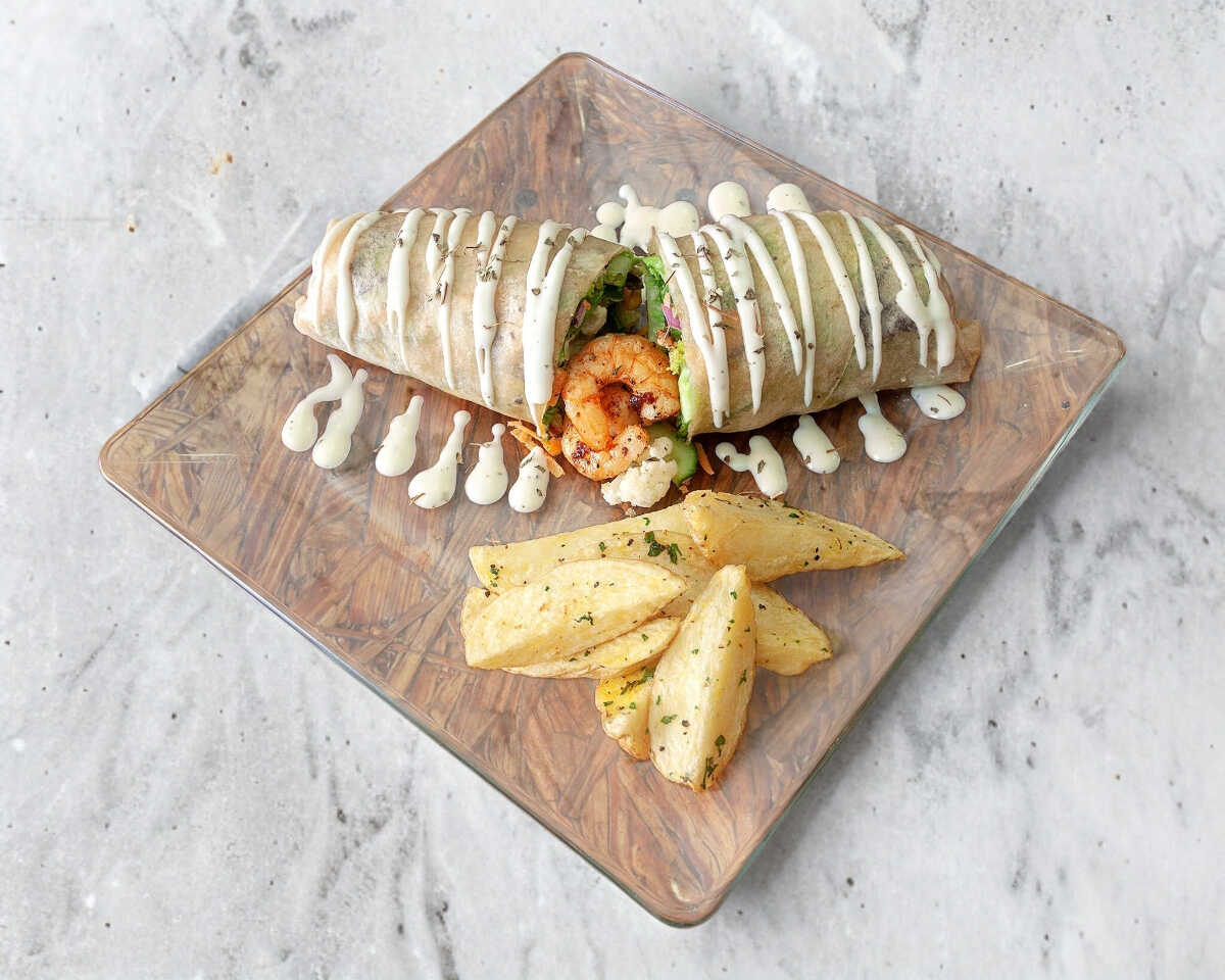 Vegetariano, mezcla de vegetales frescos, champiñones, elote, cebolla, pepino, brócoli, coliflor, aderezo ranch, tortilla de Aruba acompañado con papas bajo 100% natural.