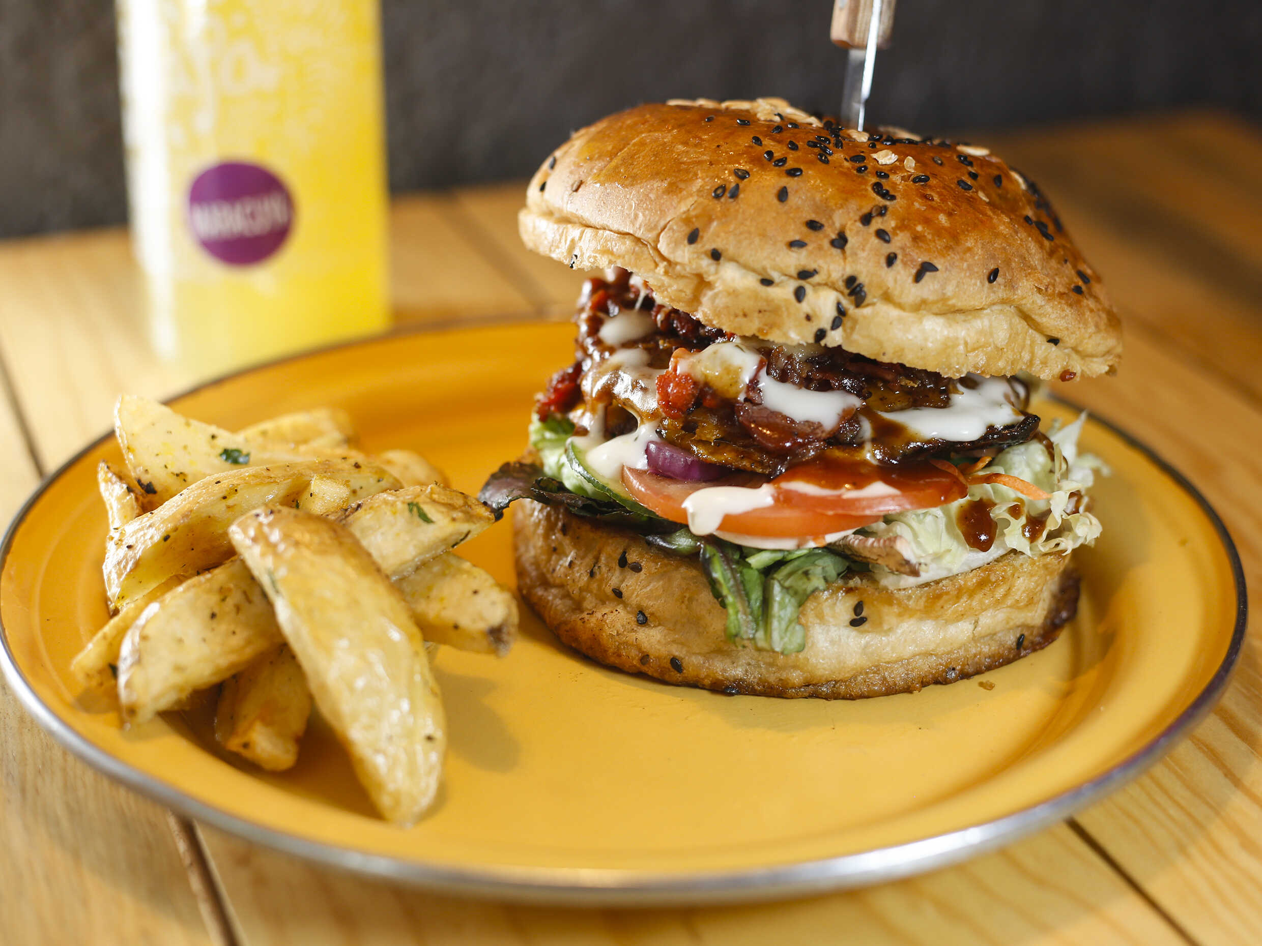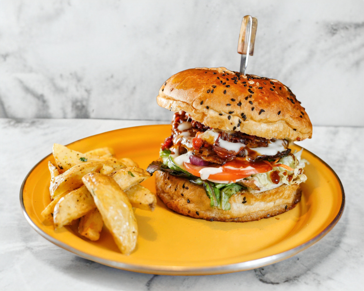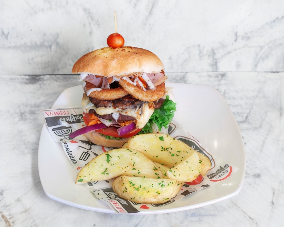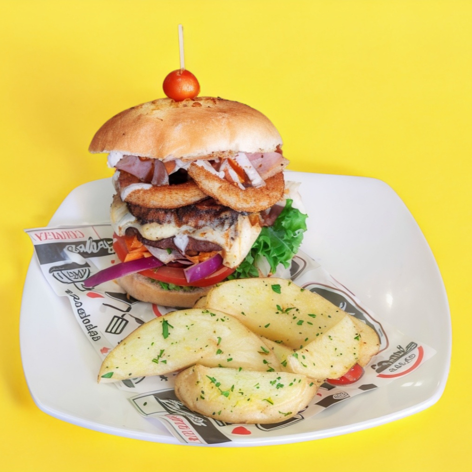 Carne 100% de res y arrachera de la casa,pan artesanal, vegetales del dia,queso amarillo, tocino, cebolla caramelizada a la bbq acompañada de Aros de Cebolla.
