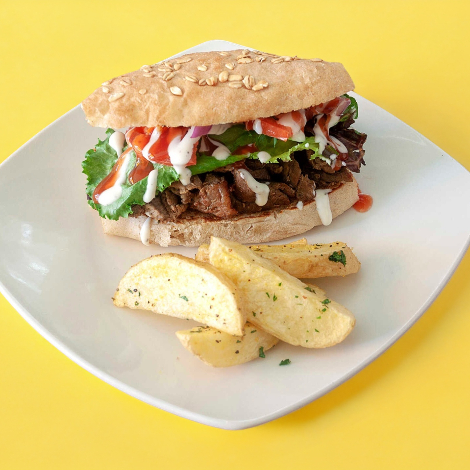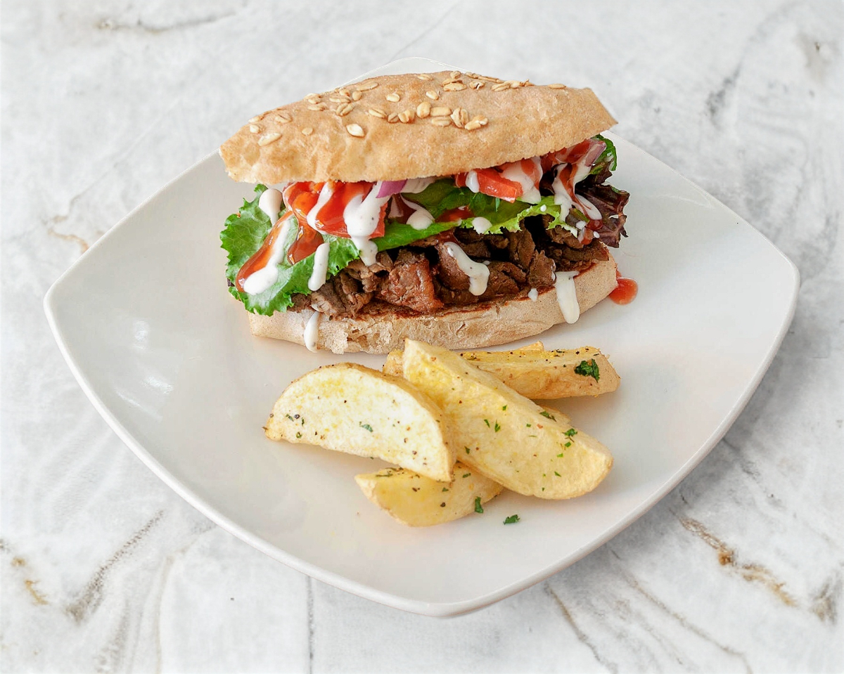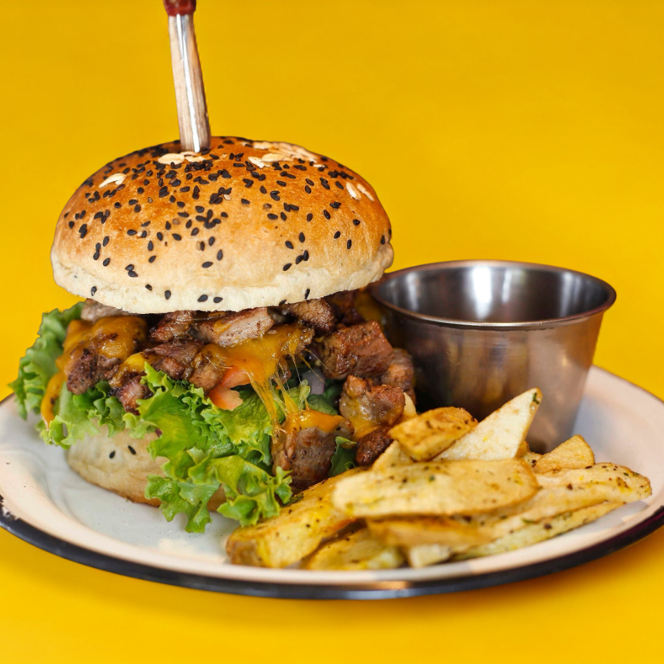 Pan brioche, doble porcion de arrachera marinada, cebollitas caramelizadas BBQ, queso cheddar, tocino, queso mozarella, vegetales frescos, salsa gravy dip.