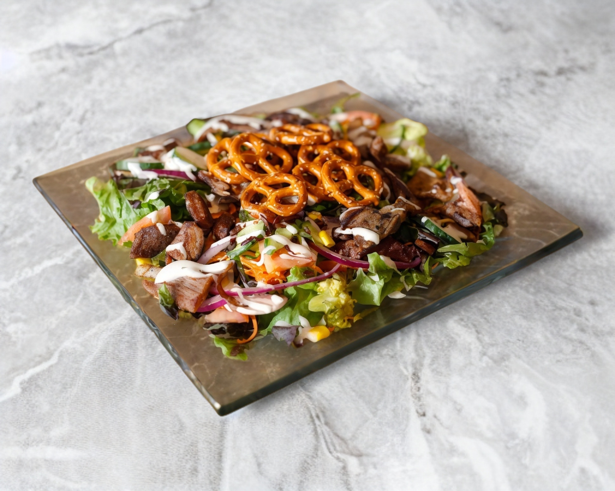 130 grs de salmón fresco. Vegetales frescos de la casa, lechuga, jitomate, cebolla, zanahoria, champiñones, brócoli, coliflor. Aderezo, pretzels.