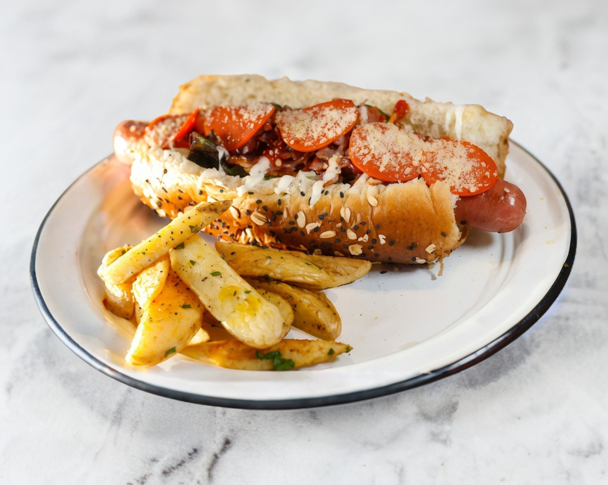 Salchicha, Tocino, Queso Parmesano,salsa Chili