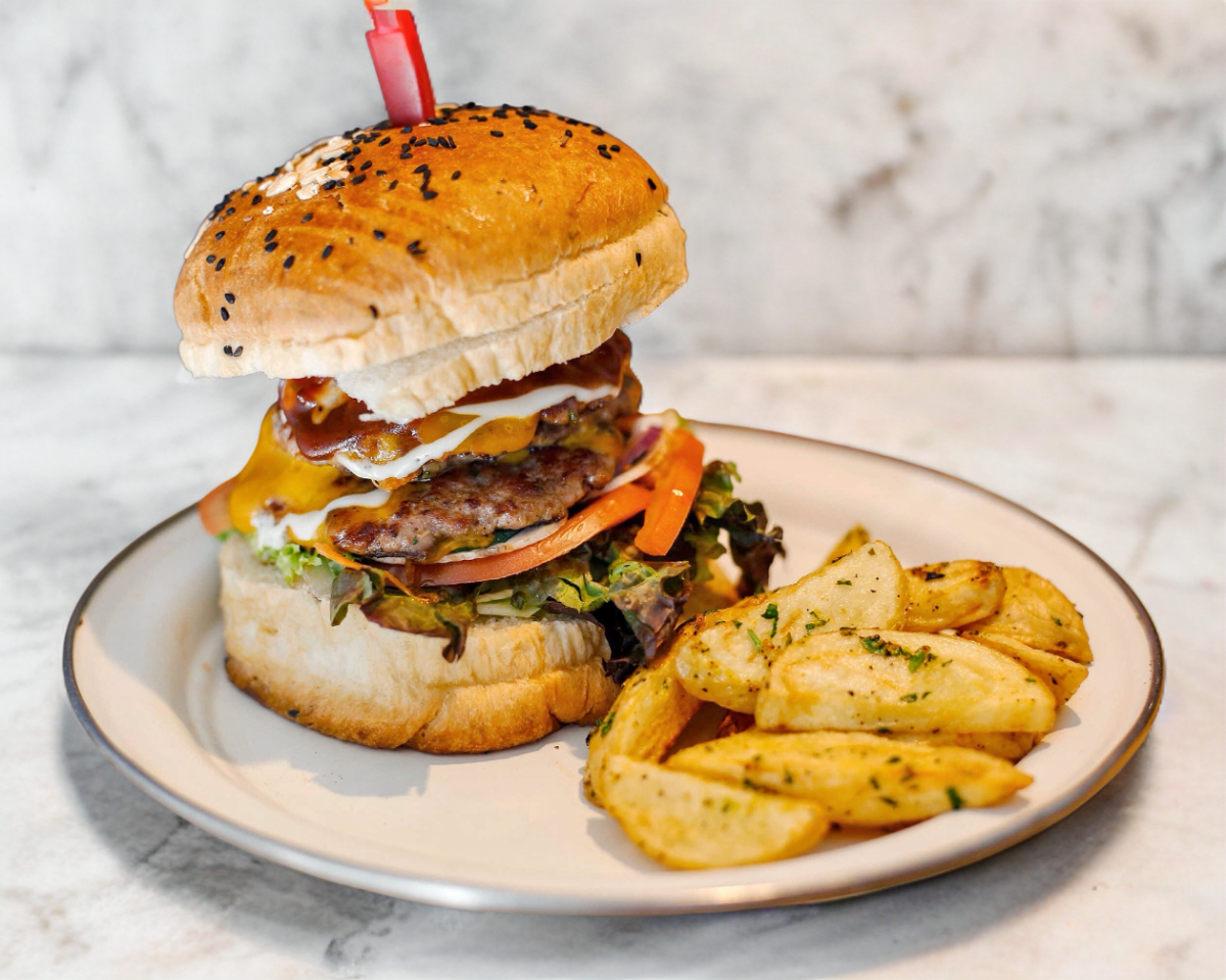 Carne de res y arrachera 100% de la casa,pan artesanal, vegetales frescos del dia, papas gajo 100% naturales, tocino, aros de cebolla y queso mozarella.