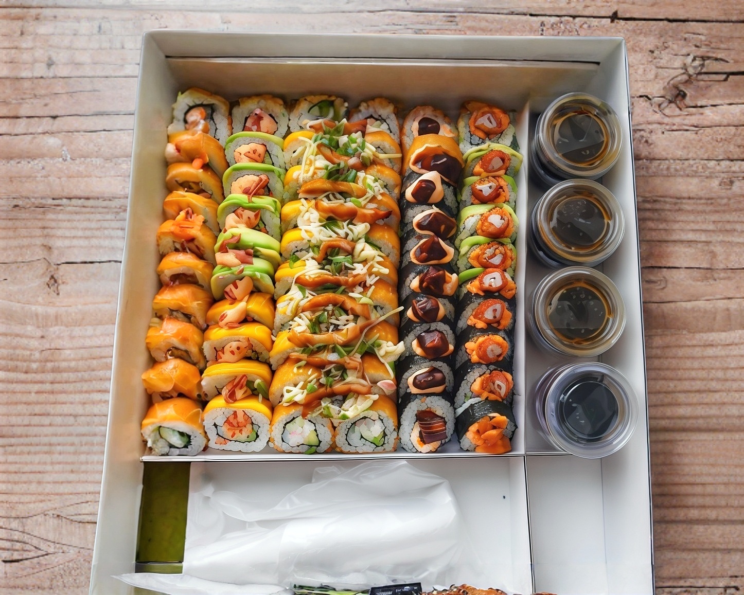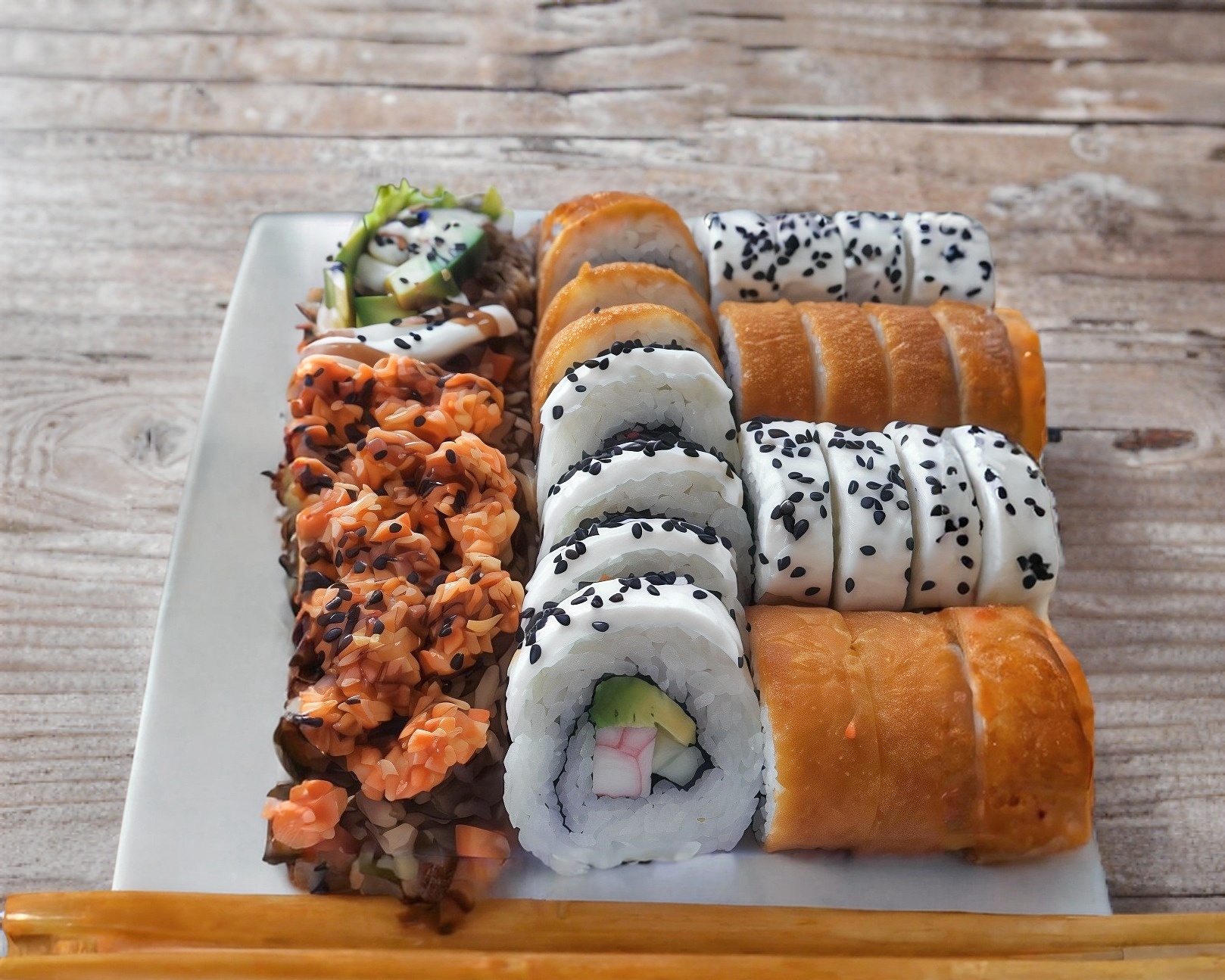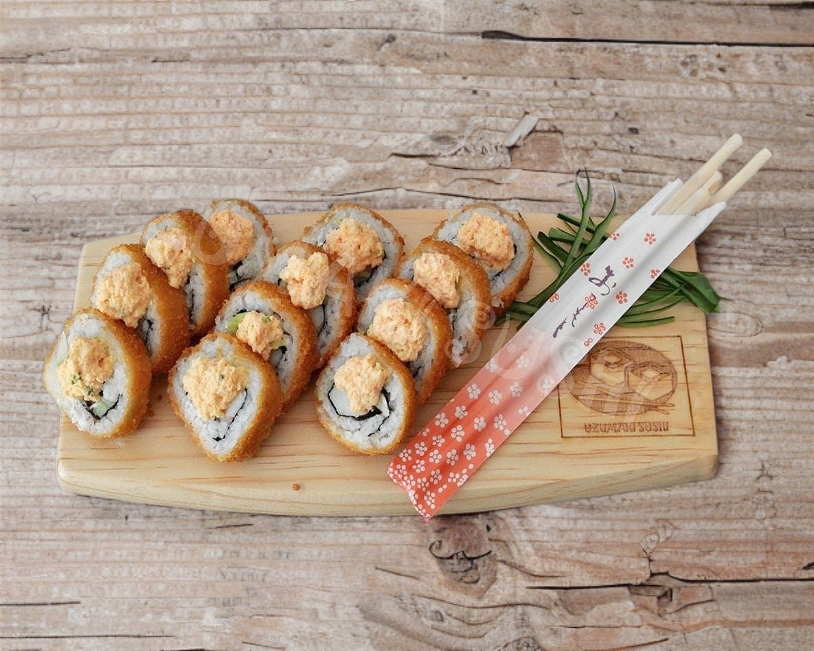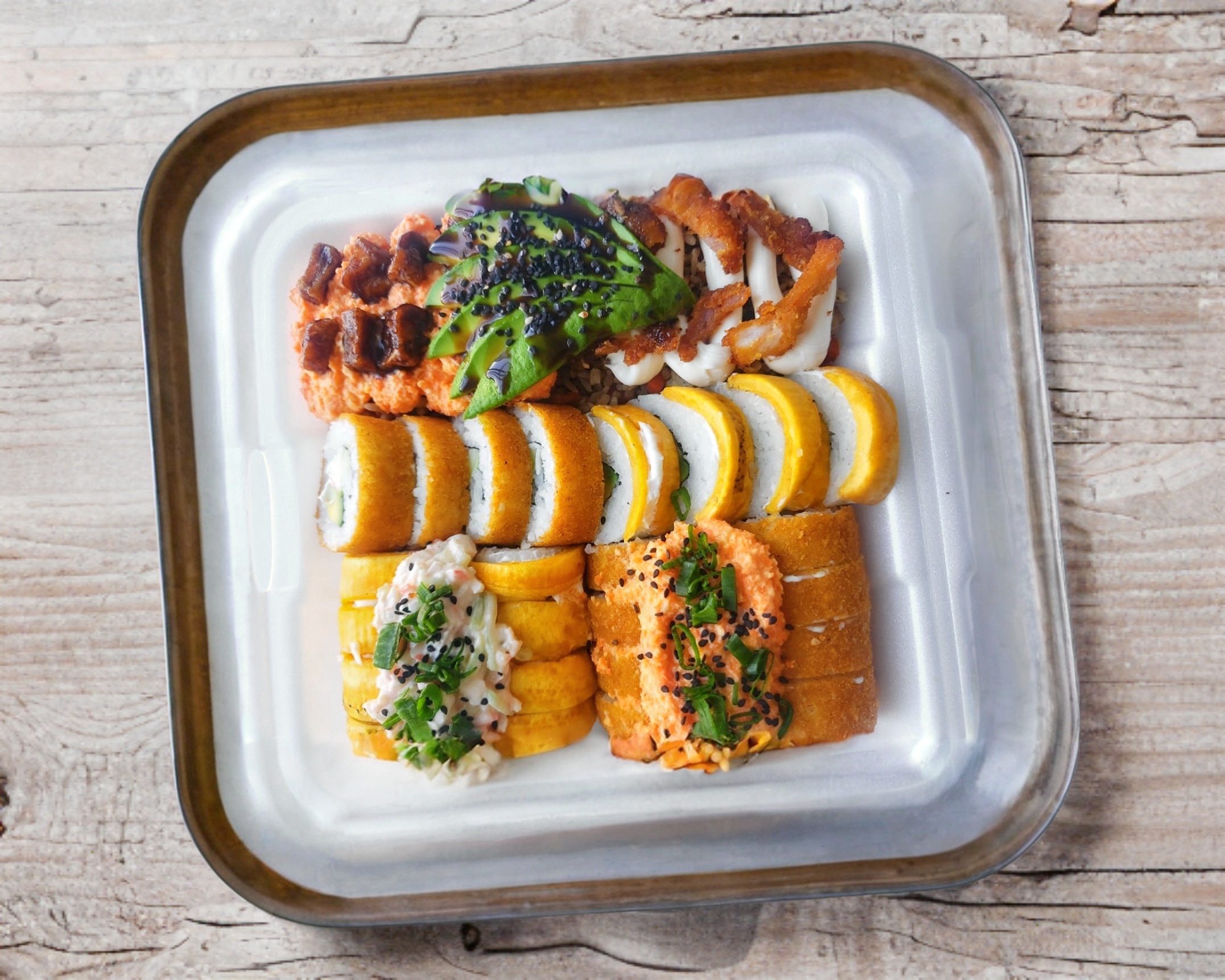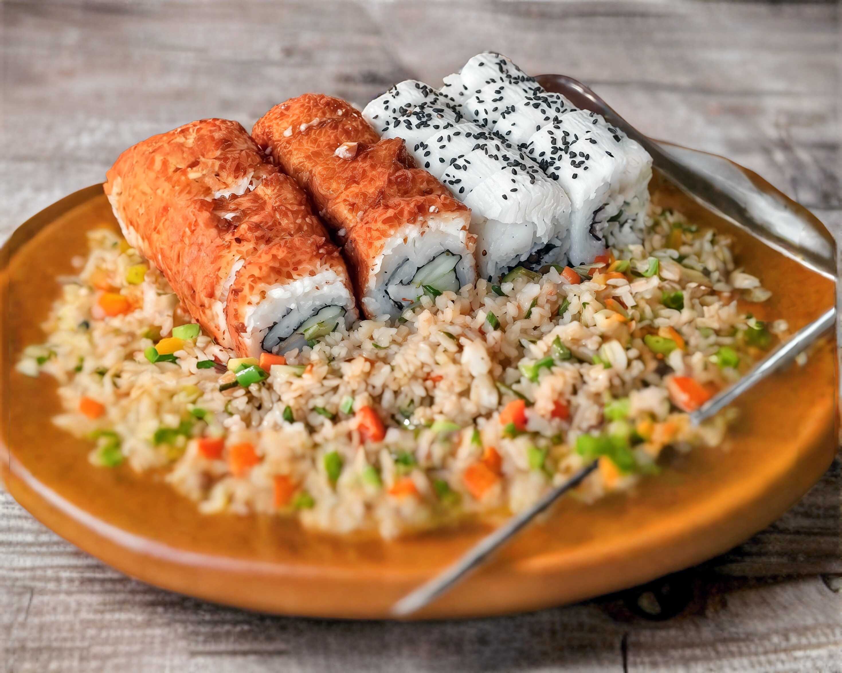 2 rollos de sushi de 12 piezas cada uno empanizados por fuera rellenos de proteína a elegir, zanahoria, queso crema y pepino. Para dos personas maximo.