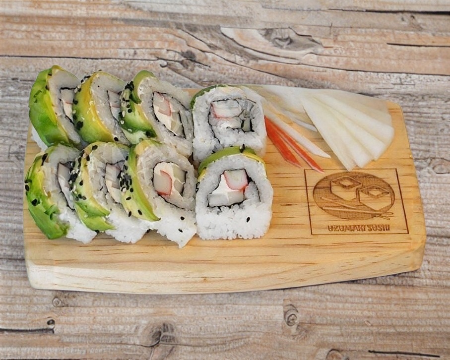 Sushi de aguacate por fuera, proteína a elegir, relleno de philadelphia, zanahoria y pepino.