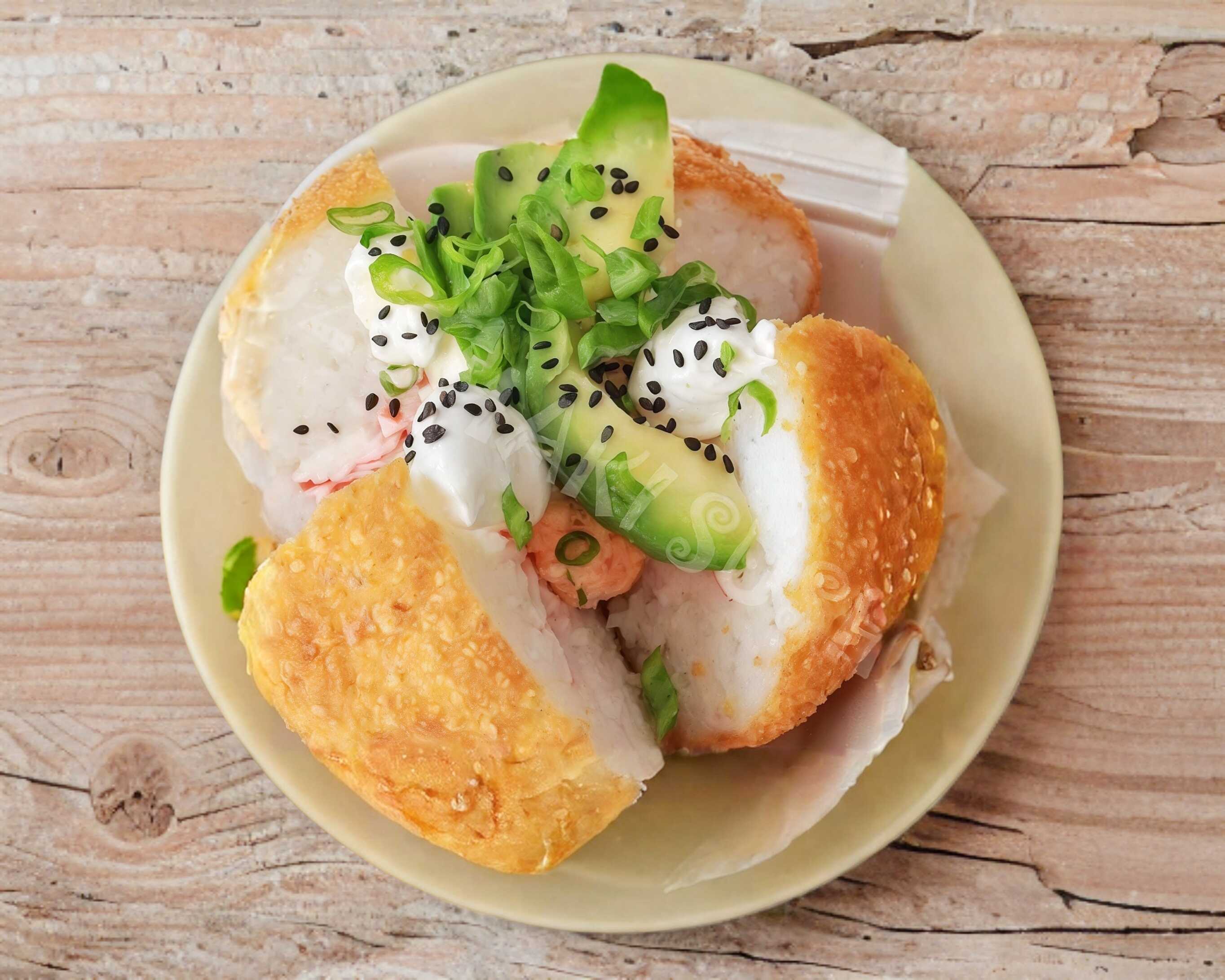 Bola de arroz empanizada rellena de proteína a elegir, queso crema, pepino, ensalada de cangrejo, aguacate, cebollín y salsa de anguila