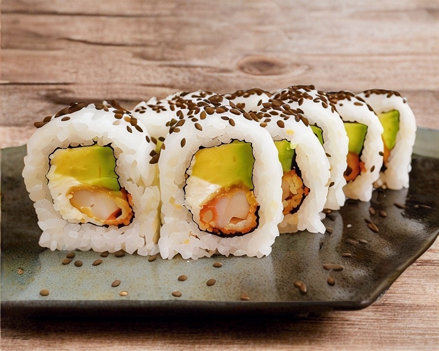 Sushi capeado con tempura por fuera relleno de proteína a elegir, aguacate, queso crema y pepino.