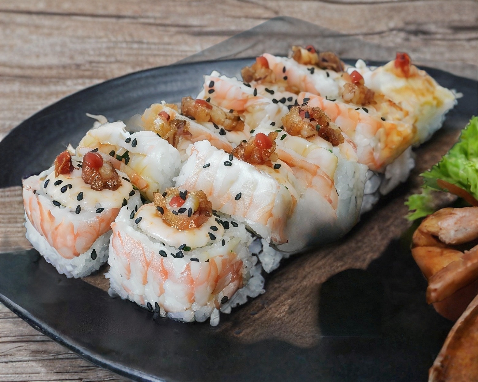 Rollo de sushi con camarón, philadelphia y pepino, cubierto de aguacate, ensalada de kanicama, camarón empanizado en salsa de anguila.