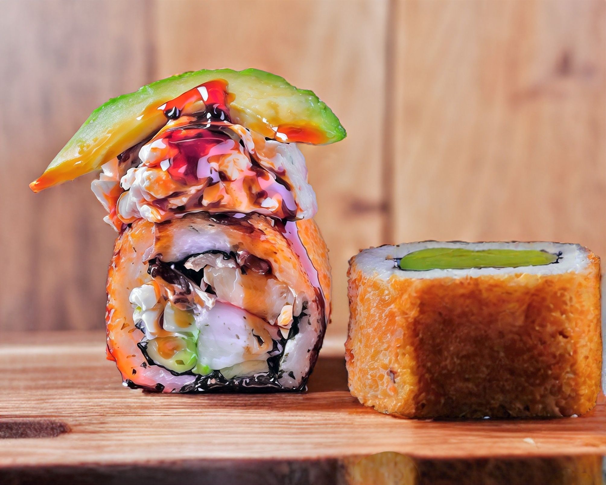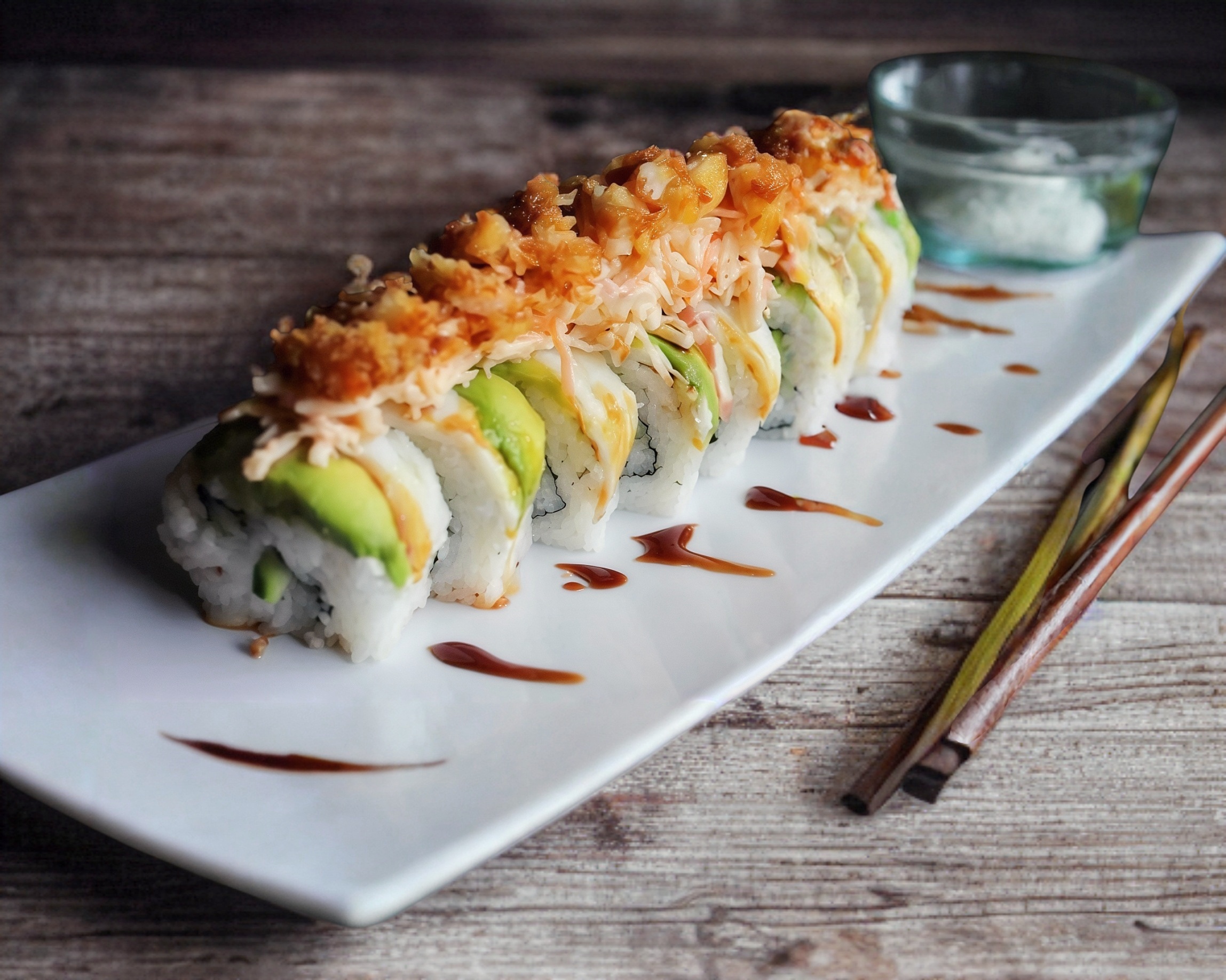Rollo de 12 piezas de sushi relleno de pollo, res, aguacate y philadelphia empanizado con tampico, aguacate y salsa de anguila.