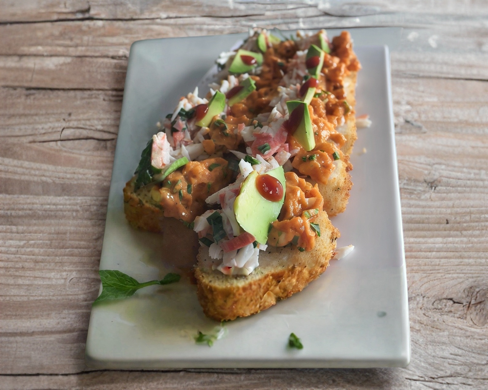 Rollo de sushi cangrejo y pepino con philadelphia empanizado con aderezo de chipotle.