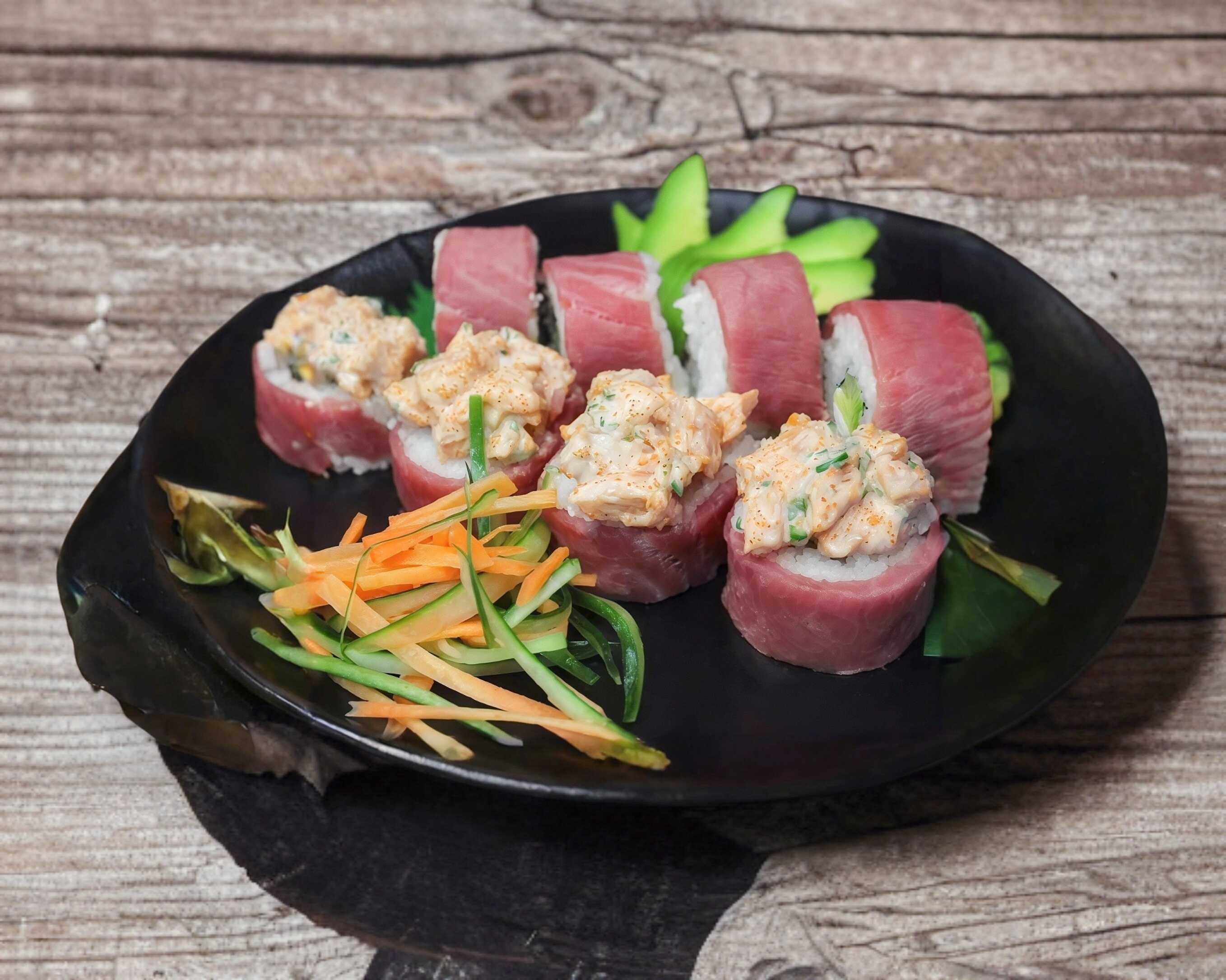 Rollo de 12 piezas de sushi con aguacate y pepino, cubierto de atún y philadelphia, con topping de atún spicy, toque de siracha y aguacate.