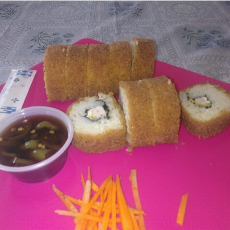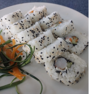 Queso crema por fuera por dentro camarón aguacate pepino zanahoria alga