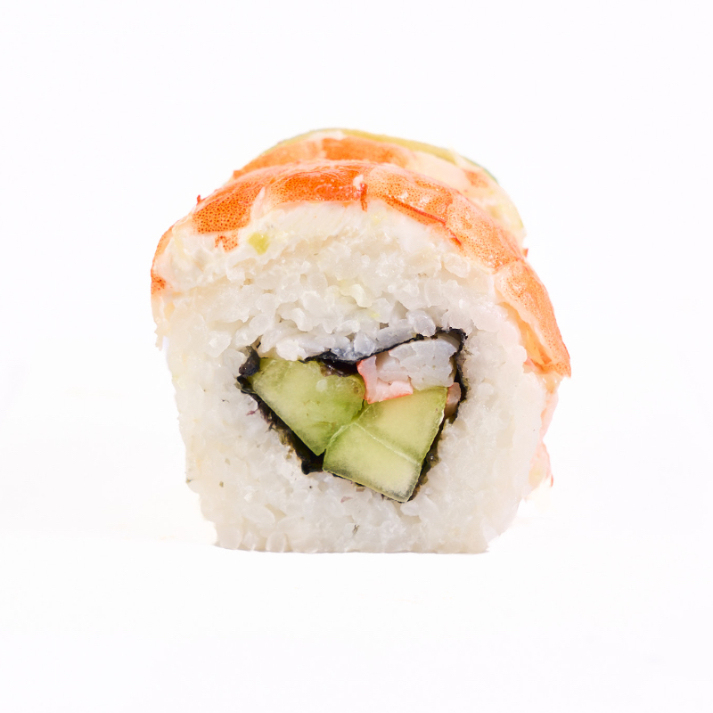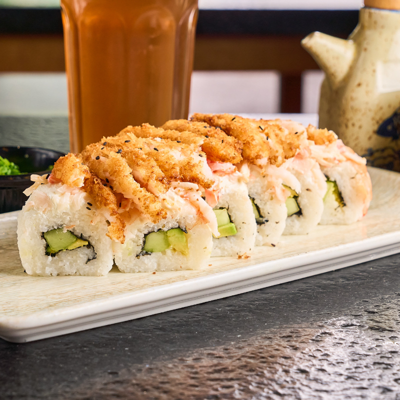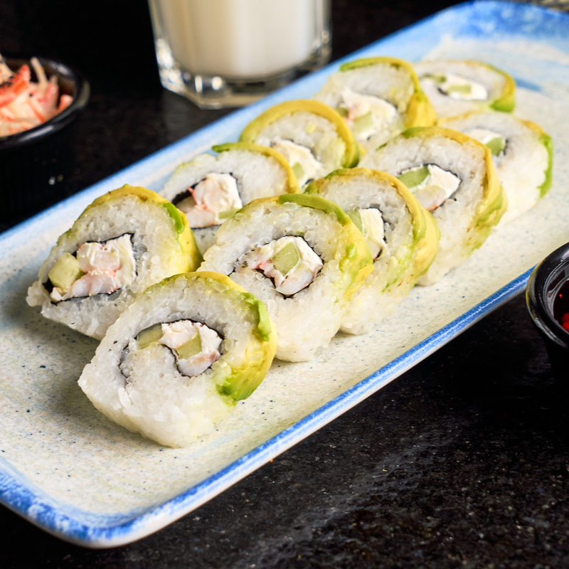 Aguacate por fuera, por dentro, pepino queso philadelphia, camarón empanizado, arriba ensalada de cangrejo y tocino