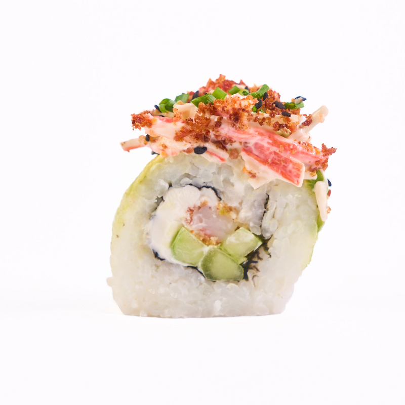 POR DENTRO: SURIMI EMPANIZADO, PHILADELPHIA Y PEPINO, POR FUERA: AGUACATE. TOPPING: ENSALADA DE SURIMI, TOCINO, CEBOLLIN Y AJONJOLI
