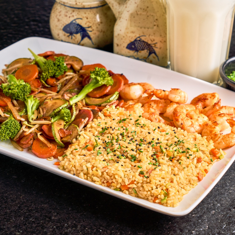 VERDURAS A LA PLANCHA, ARROZ FRITO Y CAMARON A LA PLANCHA