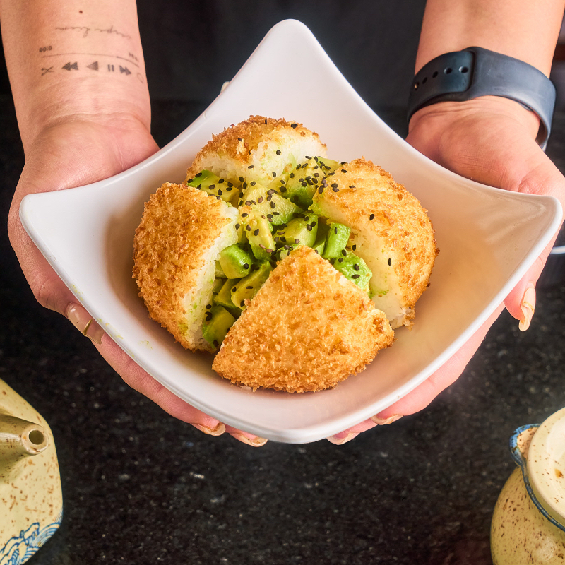 POR DENTRO: PEPINO, SURIMI Y AGUACATE. POR FUERA: PHILADELPHIA EMPANIZADO. TOPPING: ENSALADA DE SURIMI, PULPO, AGUACATE, CEBOLLIN Y AJONJOLI